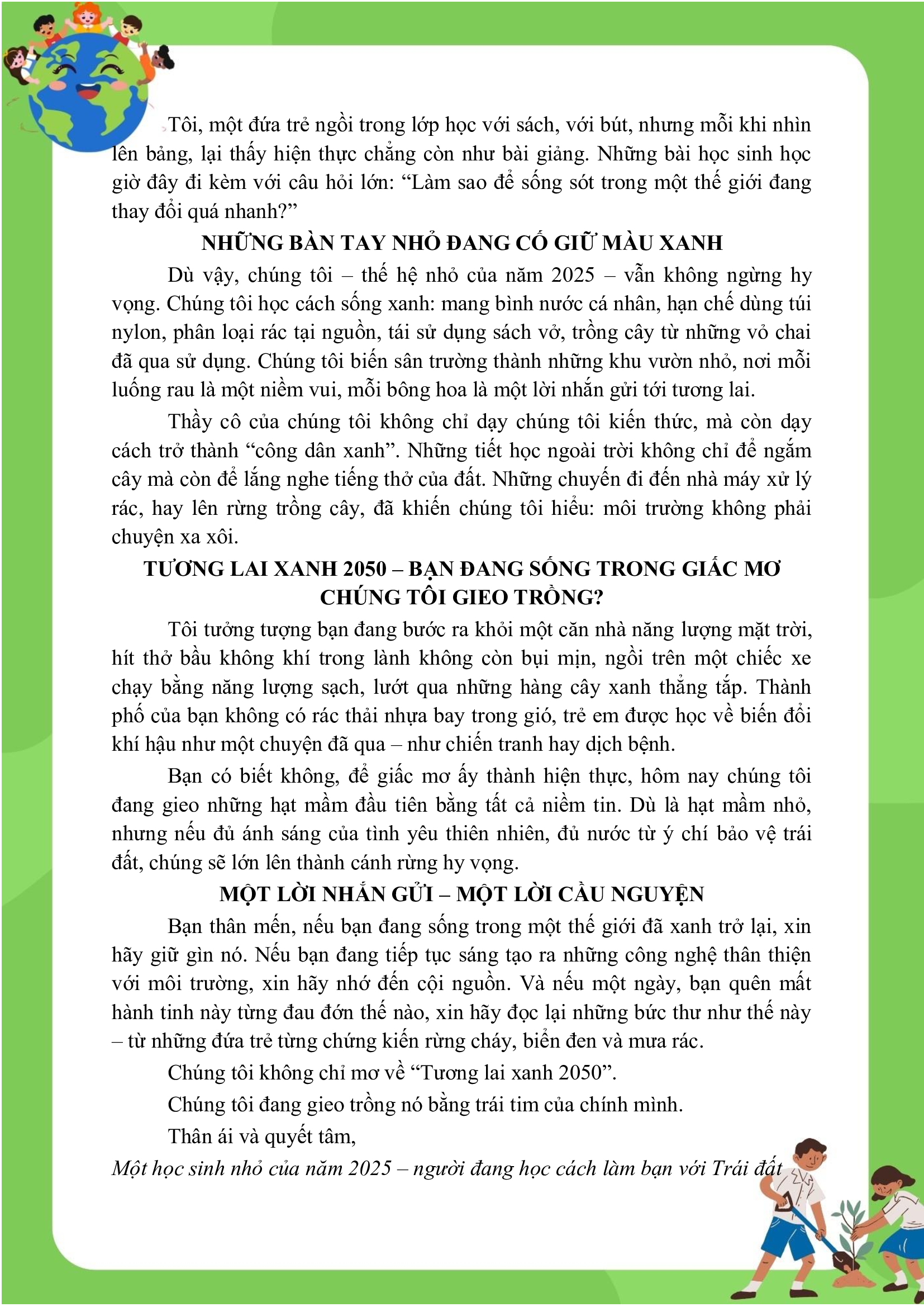 Chia sẻ uớc mơ liên quan đến năng lượng xanh, giáo dục xanh, lối sống xanh về cuộc sống xanh trên Trái đất vào năm 2050.