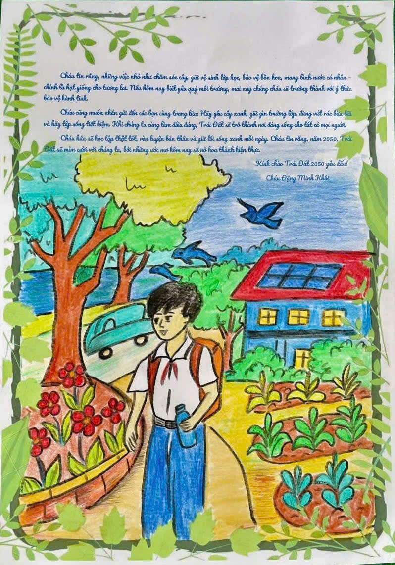 “Cháu là Minh Khôi, học sinh lớp 6. Ở ngôi trường mới, cháu được sống trong một không gian xanh: sân trường rợp bóng cây, bồn hoa rực rỡ, khu vườn rau trải nghiệm và thói quen mang bình nước cá nhân thay chai nhựa. Từ những việc nhỏ như chăm sóc cây, giữ vệ sinh lớp học, cháu hiểu rằng mỗi hành động nhỏ sẽ góp phần tạo nên một Trái Đất xanh. Cháu mơ đến năm 2050, mọi mái nhà đều có năng lượng mặt trời, đường phố đầy xe điện, sông biển trong lành và con người sống thân thiện với môi trường. Hôm nay chúng ta gieo hạt yêu thiên nhiên, ngày mai hành tinh sẽ nở hoa hạnh phúc. Cháu tin Trái Đất 2050 sẽ mỉm cười với chúng ta.”