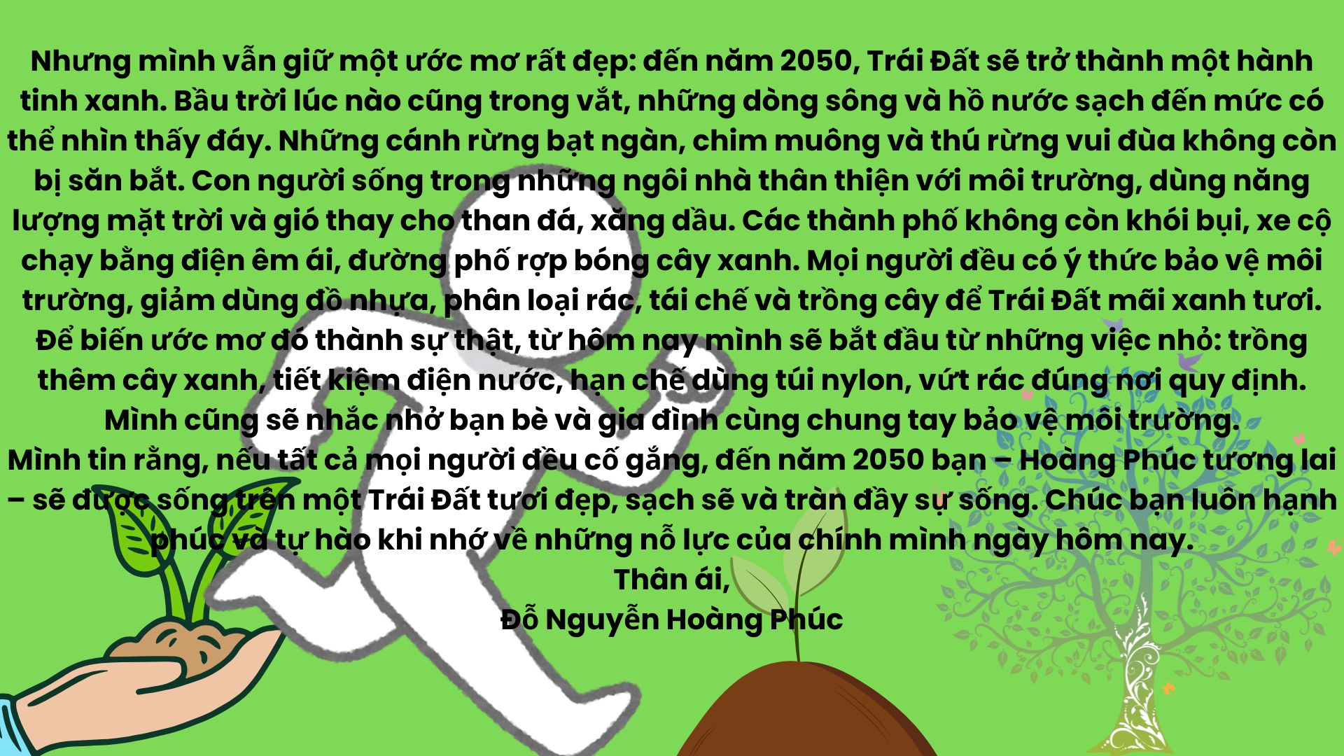 Chia sẻ uớc mơ liên quan đến năng lượng xanh, giáo dục xanh, lối sống xanh về cuộc sống xanh trên Trái đất vào năm 2050.