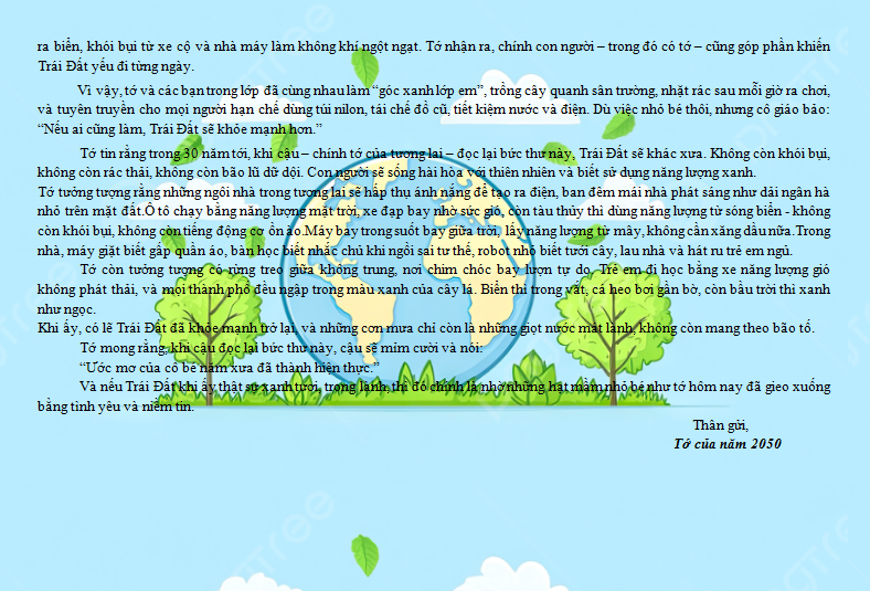 Chia sẻ uớc mơ liên quan đến năng lượng xanh, giáo dục xanh, lối sống xanh về cuộc sống xanh trên Trái đất vào năm 2050.