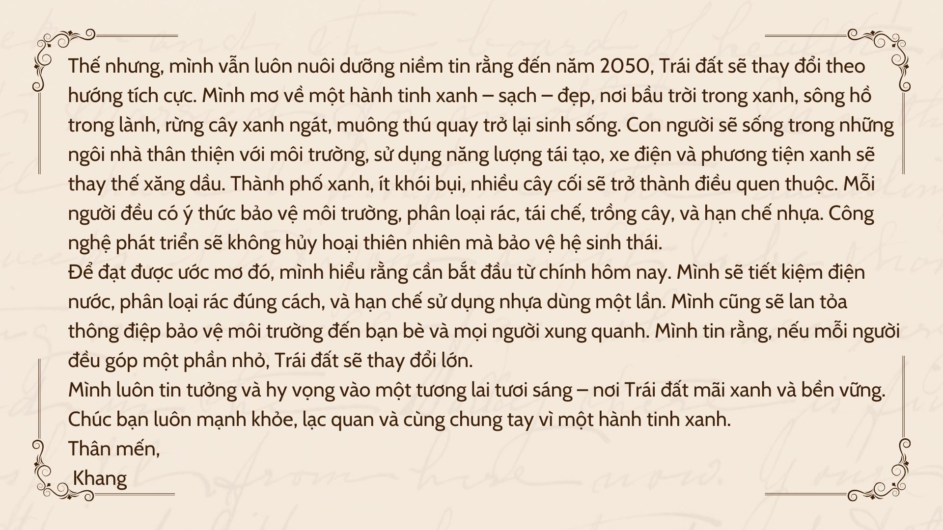 Chia sẻ uớc mơ liên quan đến năng lượng xanh, giáo dục xanh, lối sống xanh về cuộc sống xanh trên Trái đất vào năm 2050.