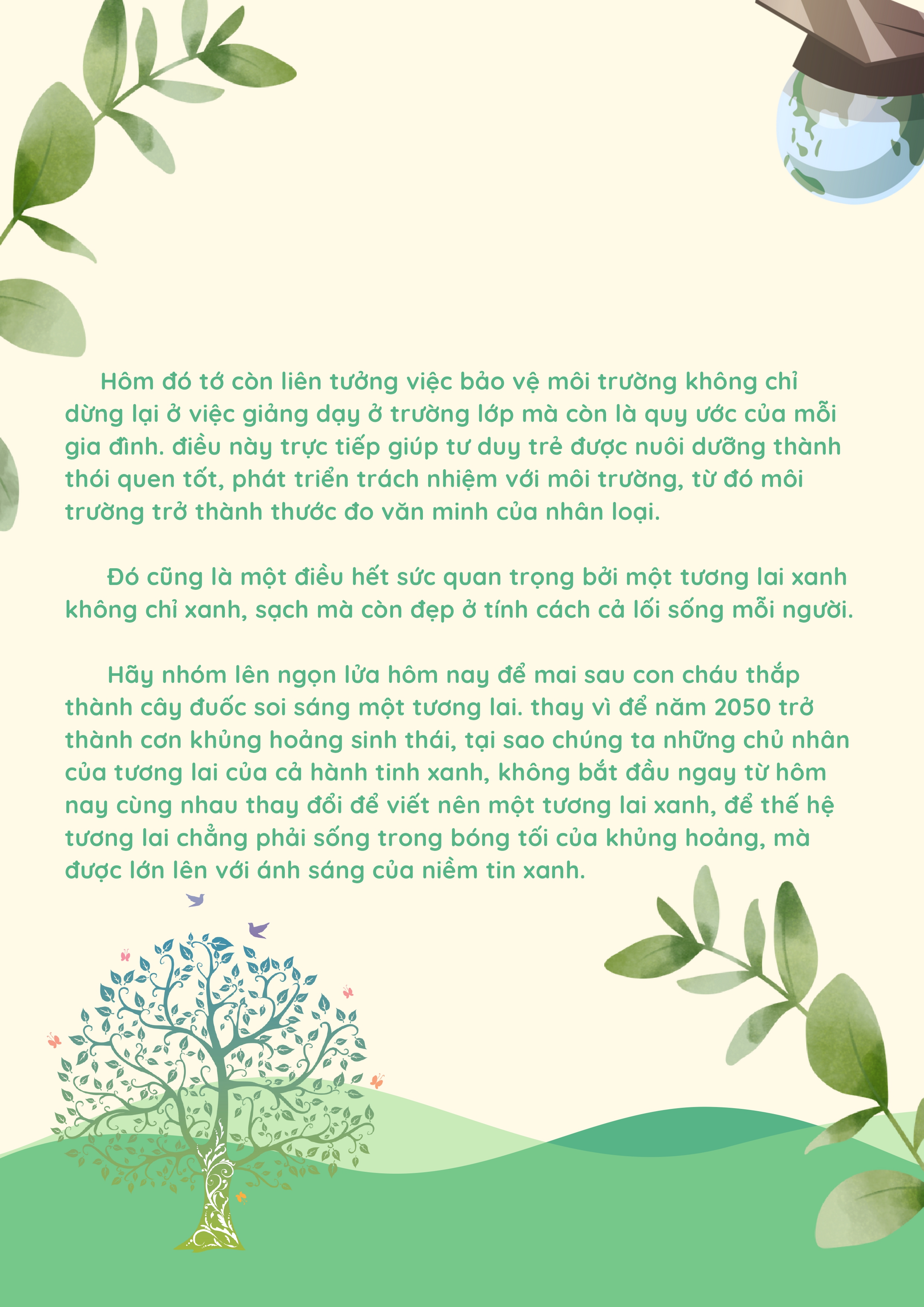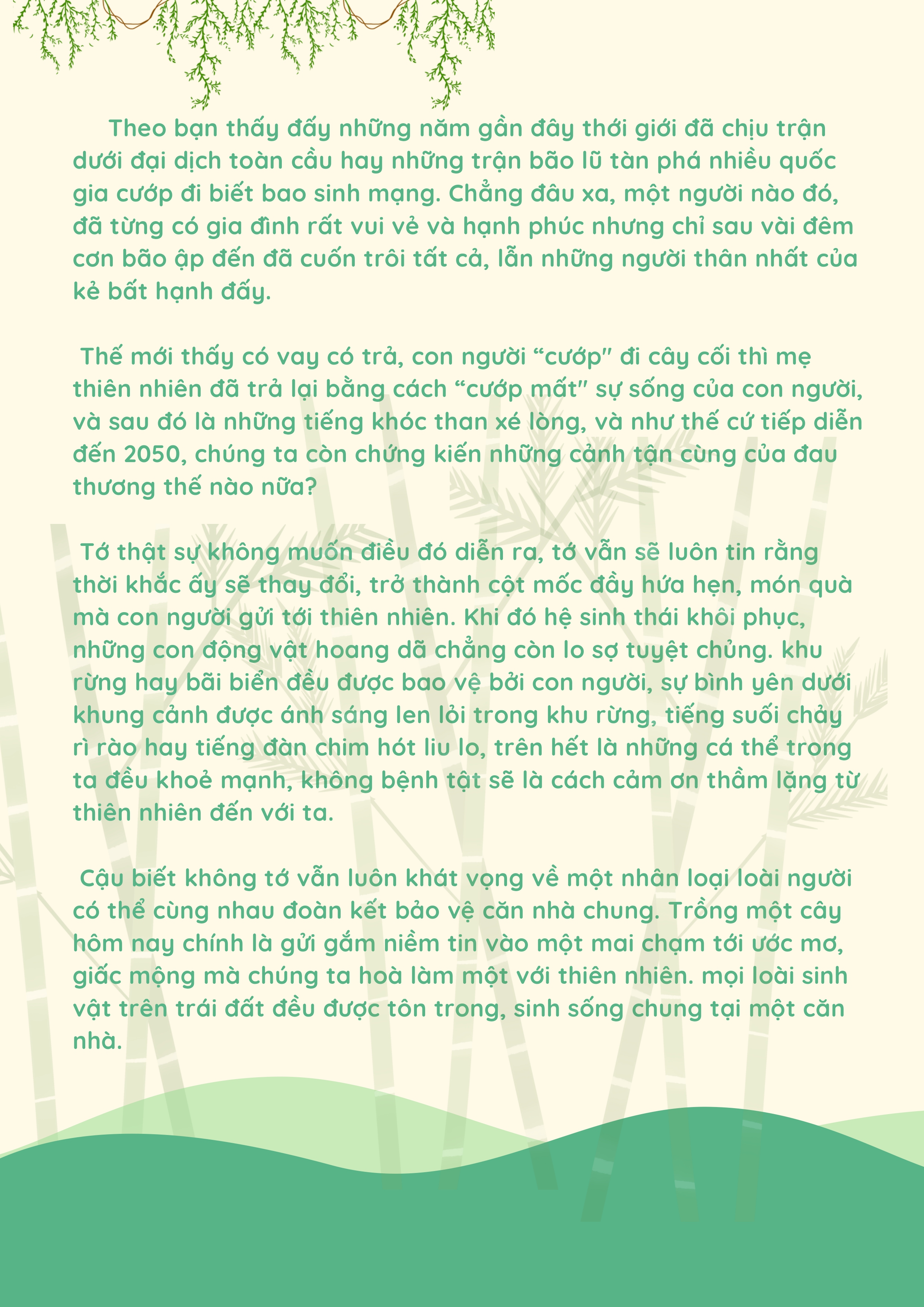 Chia sẻ uớc mơ liên quan đến năng lượng xanh, giáo dục xanh, lối sống xanh về cuộc sống xanh trên Trái đất vào năm 2050.