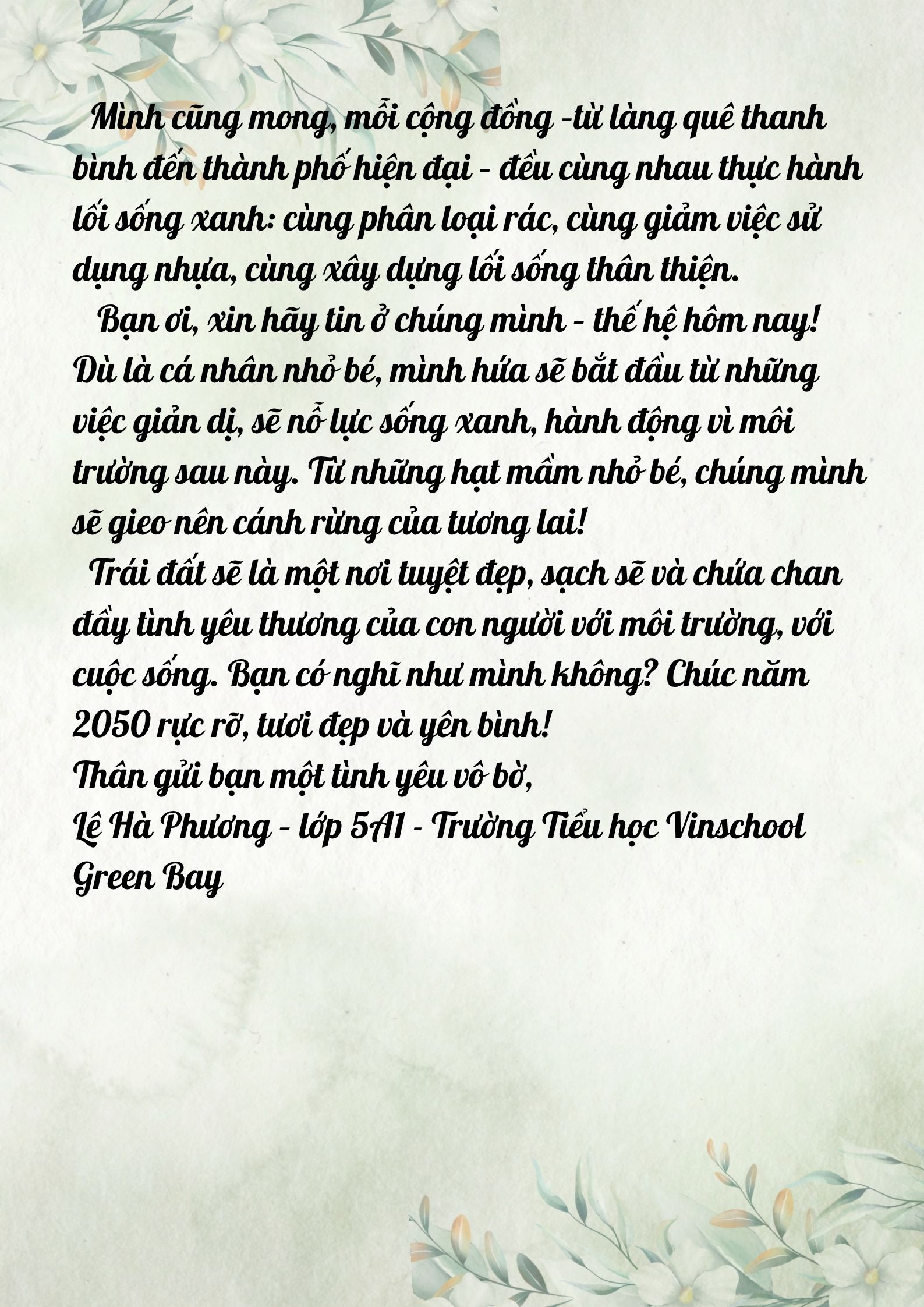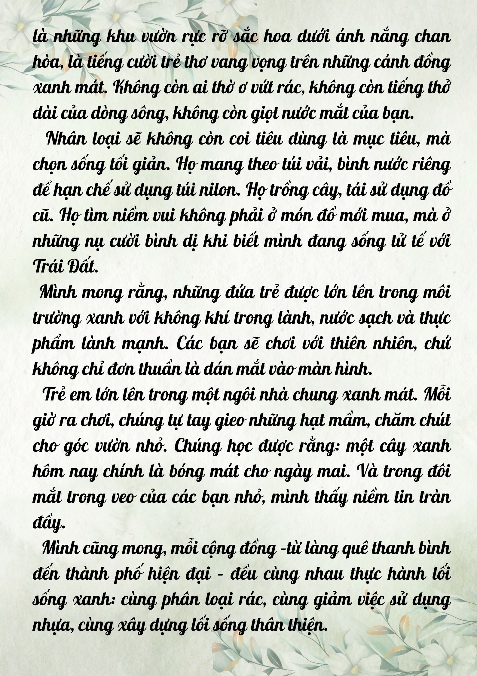 Chia sẻ uớc mơ liên quan đến năng lượng xanh, giáo dục xanh, lối sống xanh về cuộc sống xanh trên Trái đất vào năm 2050.