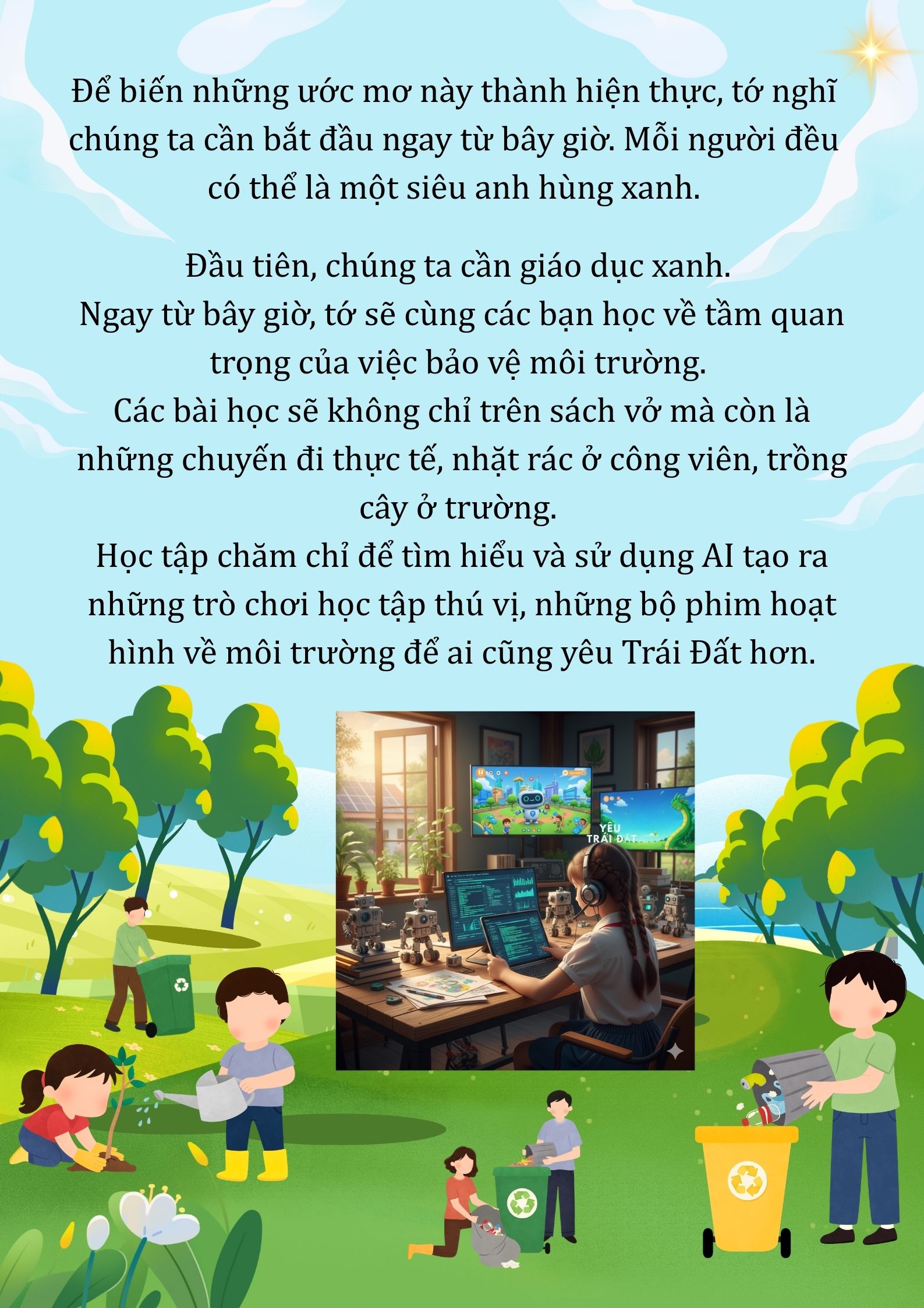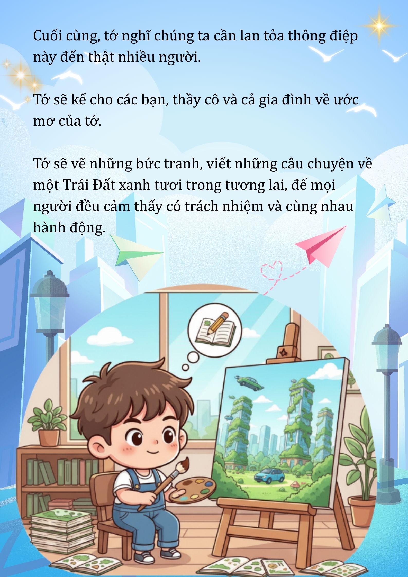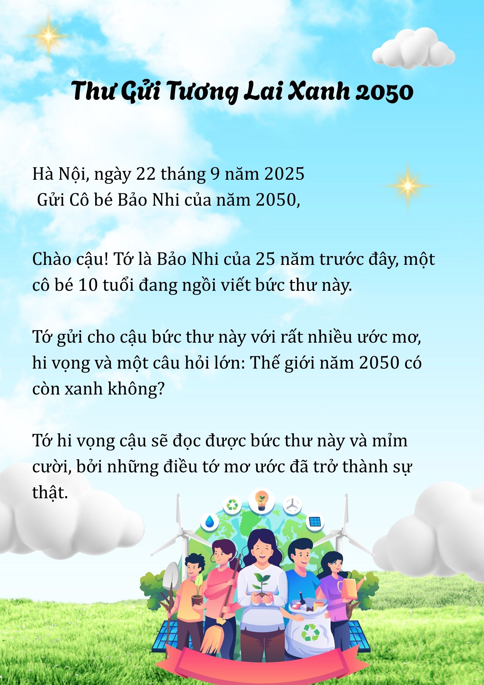 Chia sẻ uớc mơ liên quan đến năng lượng xanh, giáo dục xanh, lối sống xanh về cuộc sống xanh trên Trái đất vào năm 2050.