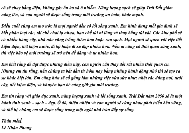 Chia sẻ uớc mơ liên quan đến năng lượng xanh, giáo dục xanh, lối sống xanh về cuộc sống xanh trên Trái đất vào năm 2050.
