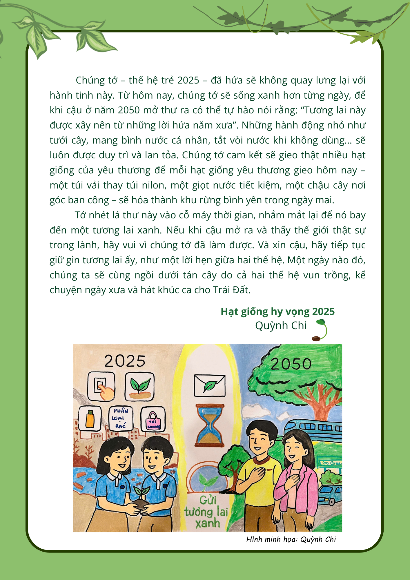 Chia sẻ uớc mơ liên quan đến năng lượng xanh, giáo dục xanh, lối sống xanh về cuộc sống xanh trên Trái đất vào năm 2050.
