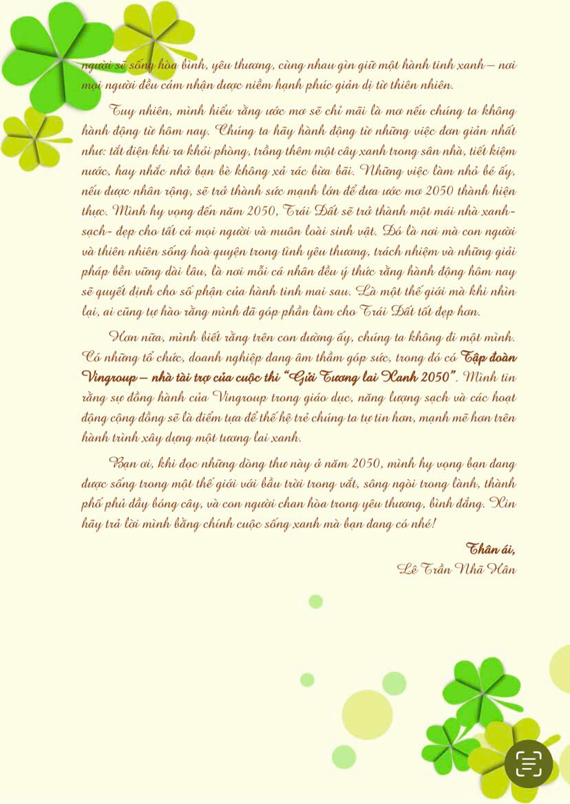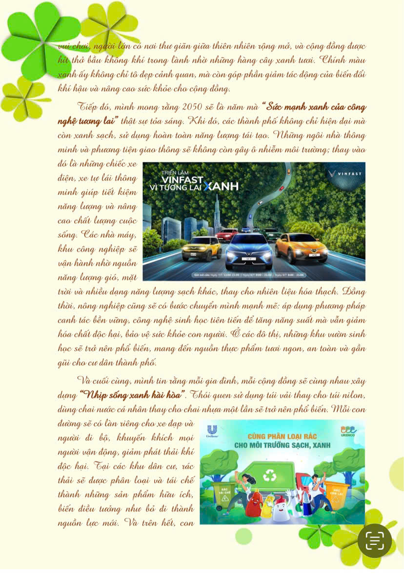 Chia sẻ uớc mơ liên quan đến năng lượng xanh, giáo dục xanh, lối sống xanh về cuộc sống xanh trên Trái đất vào năm 2050.