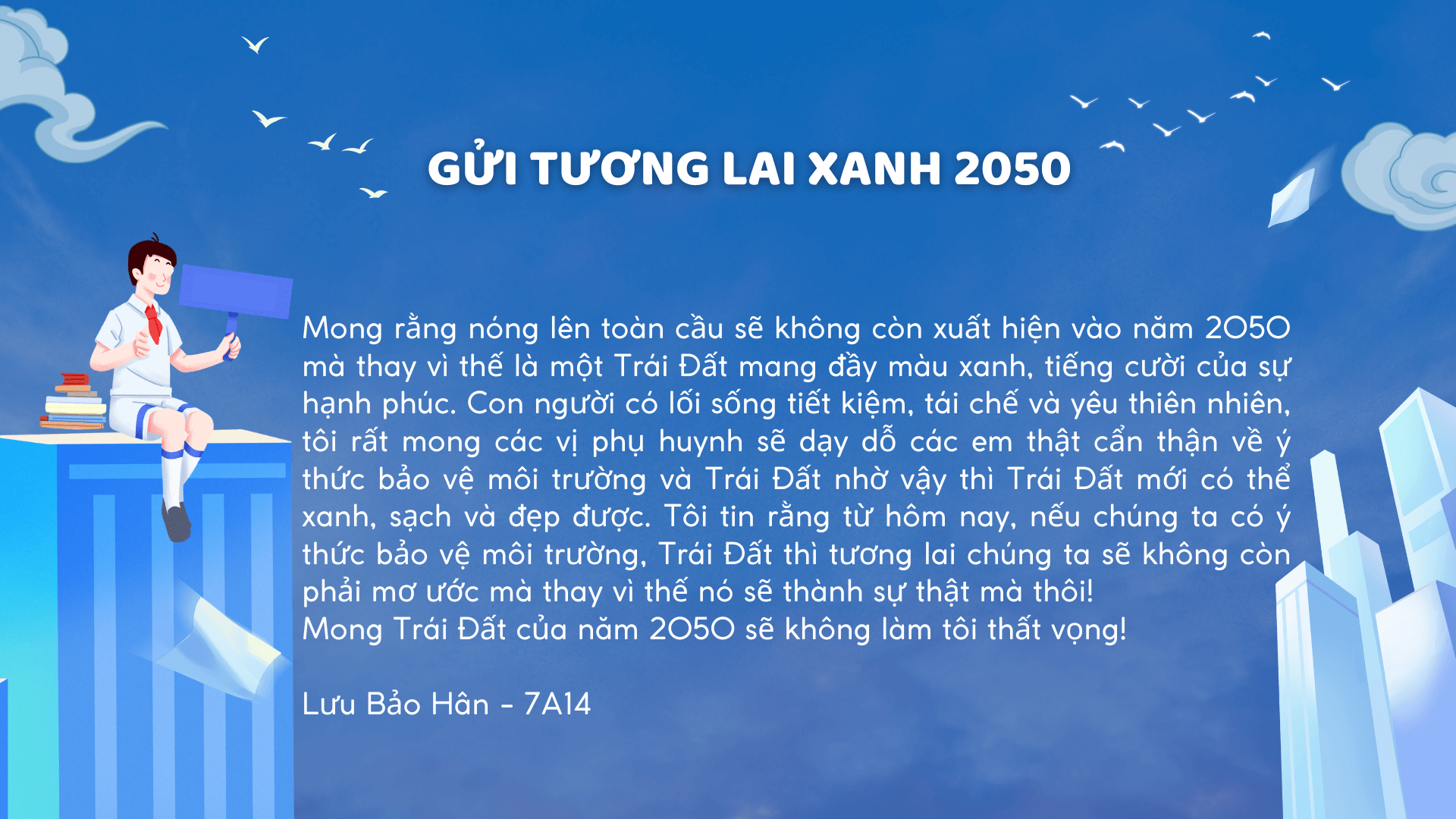 Chia sẻ uớc mơ liên quan đến năng lượng xanh, giáo dục xanh, lối sống xanh về cuộc sống xanh trên Trái đất vào năm 2050.