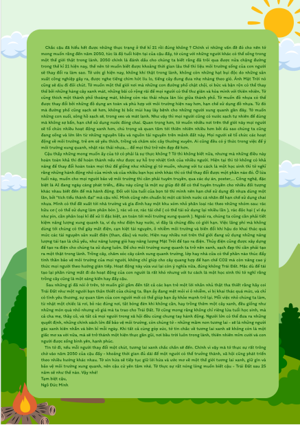 Tớ là Ngô Đức Minh, là một sinh vật sống đang tồn tại trên thân thể cậu đấy. Đây có lẽ là lần viết thư đặc biệt mà mình muốn gửi gắm tới cậu. Những năm gần đây, xã hội của loài người và quần thể sinh vật đang tồn tại song hành trên hành tinh thân yêu này, đều đang càng ngày phát triển, càng đa dạng, và cũng gặp nhiều vấn đề hơn. Tớ vẫn thường mơ tưởng đến hình ảnh những chú chim hót líu lo, hình ảnh ánh Mặt Trời rực rỡ chan hòa và cả cậu - Trái Đất trở nên khỏe mạnh hơn và cũng càng ngày càng vui tươi hơn. Tớ nghĩ rằng liệu 25 năm sau, mọi thứ có giống như những gì tớ mơ tưởng không, xã hội vẫn phát triển song song với việc mọi người sẽ sống vì cậu hơn, sống với thiên nhiên, thoải mái. Theo tớ, con số 25 này không chỉ là một cột mốc thời gian trừu tượng, nó là một lời nhắc nhở, một khoảng thời gian vàng cho thế giới đang ngày càng phát triển lớn lên, những kiến thức và ý tưởng cũng từ đó mà trưởng thành hơn. Qua đó, tớ mong muốn hình ảnh một Trái Đất 2050 về một hành tinh xanh, lối sống văn minh, lành mạnh và thân thiện với môi trường của con người tác động đến cậu.