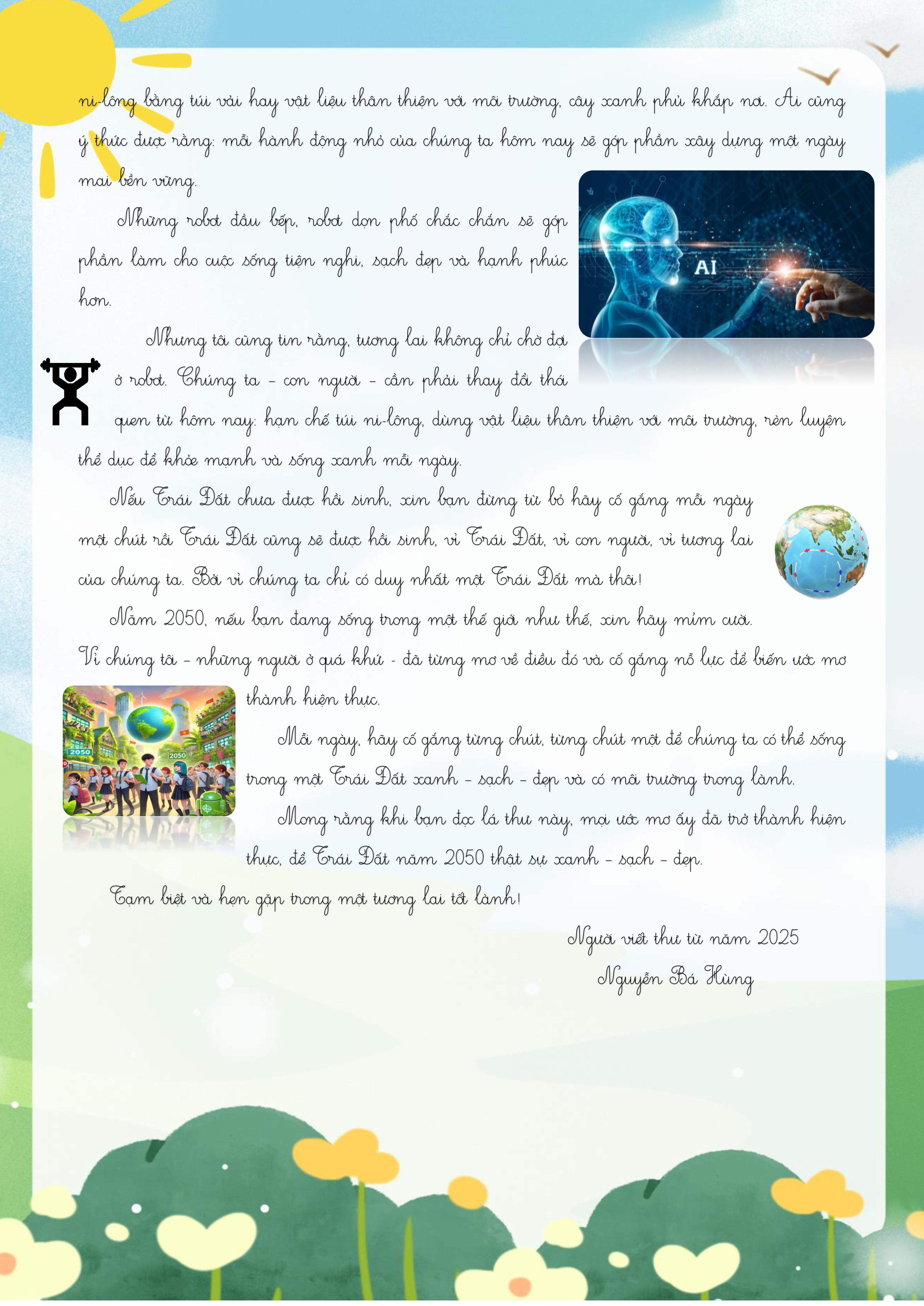Mong rằng khi bạn đọc lá thư này, mọi ước mơ ấy đã trở thành hiện thực, để Trái Đất năm 2050 thật sự xanh – sạch – đẹp.