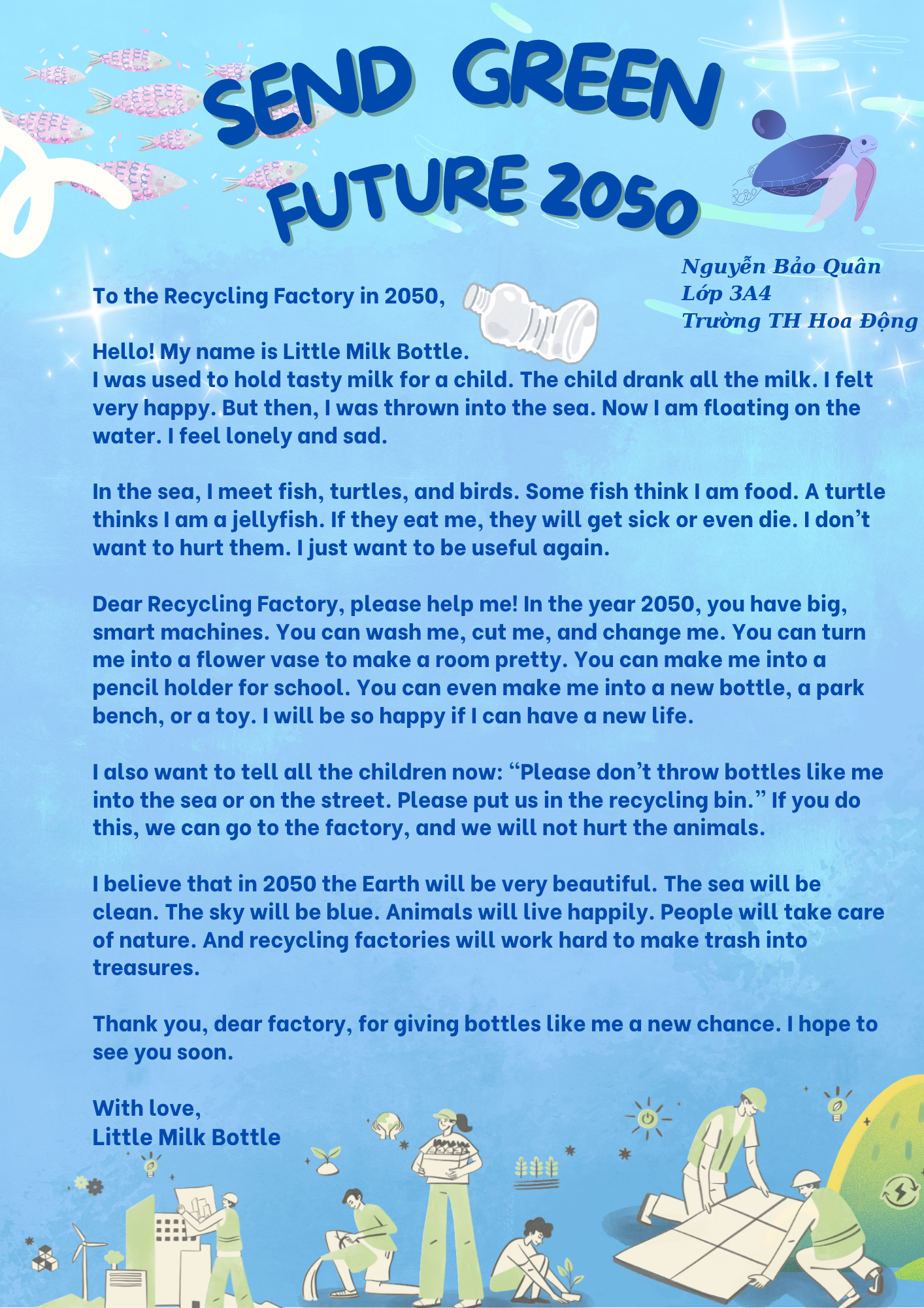 Hè vừa qua, con được cho ba mẹ đi Cát Bà. Biển rất đẹp, trong xanh nhưng vẫn có những chai nhựa bị vất xuống dập dềnh theo những con sóng. Hình ảnh đó khiến con rất trăn trở vì thế đã viết bức thư này ạ!
