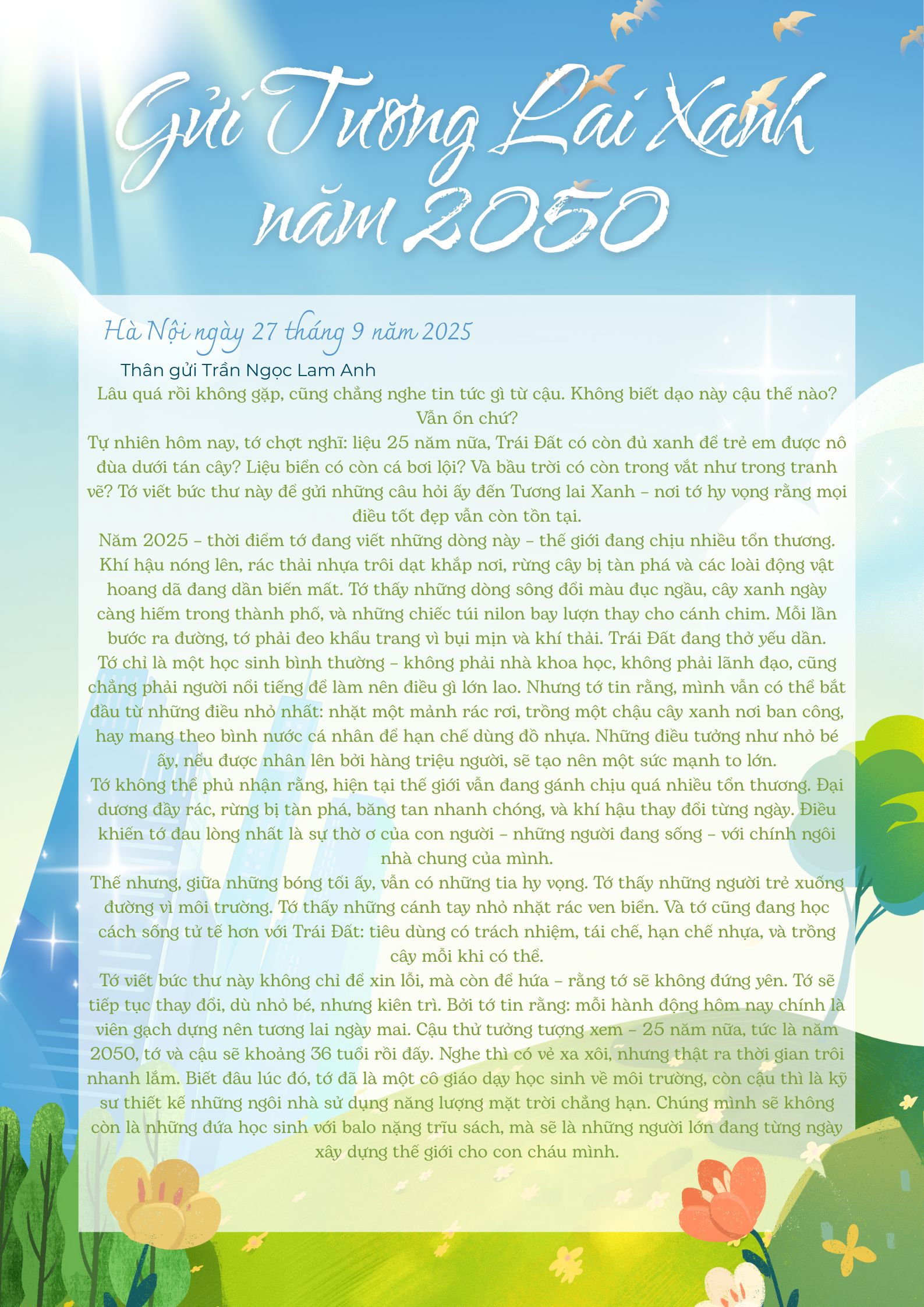 Chia sẻ uớc mơ liên quan đến năng lượng xanh, giáo dục xanh, lối sống xanh về cuộc sống xanh trên Trái đất vào năm 2050.
