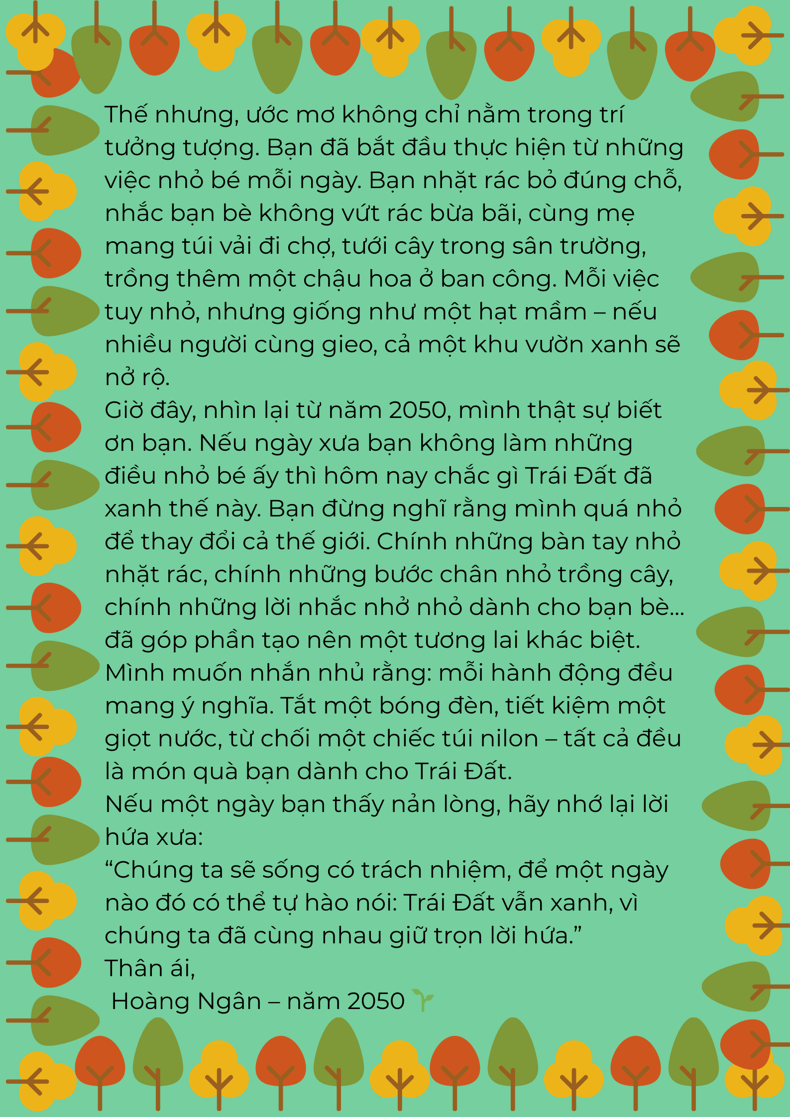 Chia sẻ uớc mơ liên quan đến năng lượng xanh, giáo dục xanh, lối sống xanh về cuộc sống xanh trên Trái đất vào năm 2050.
