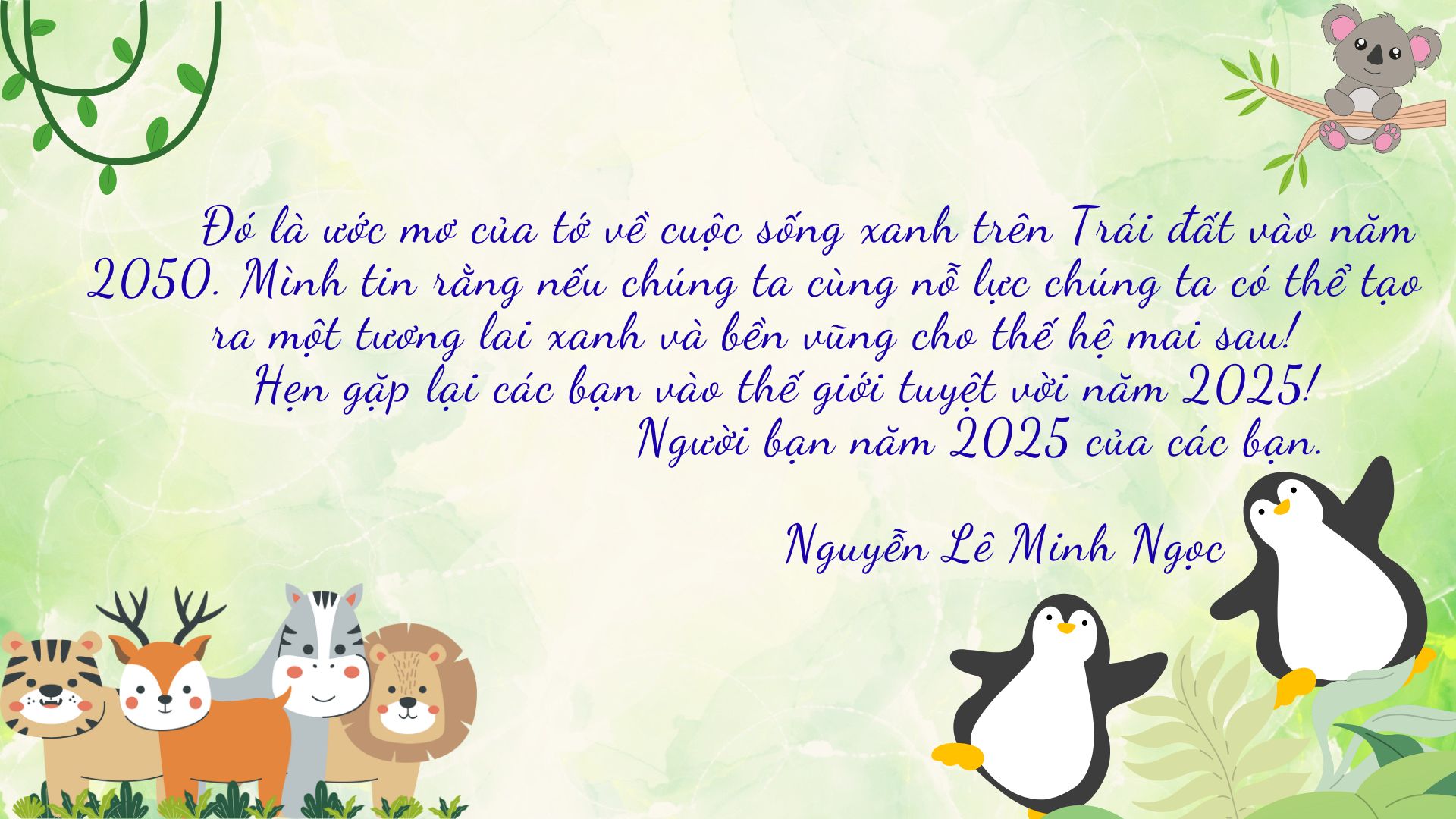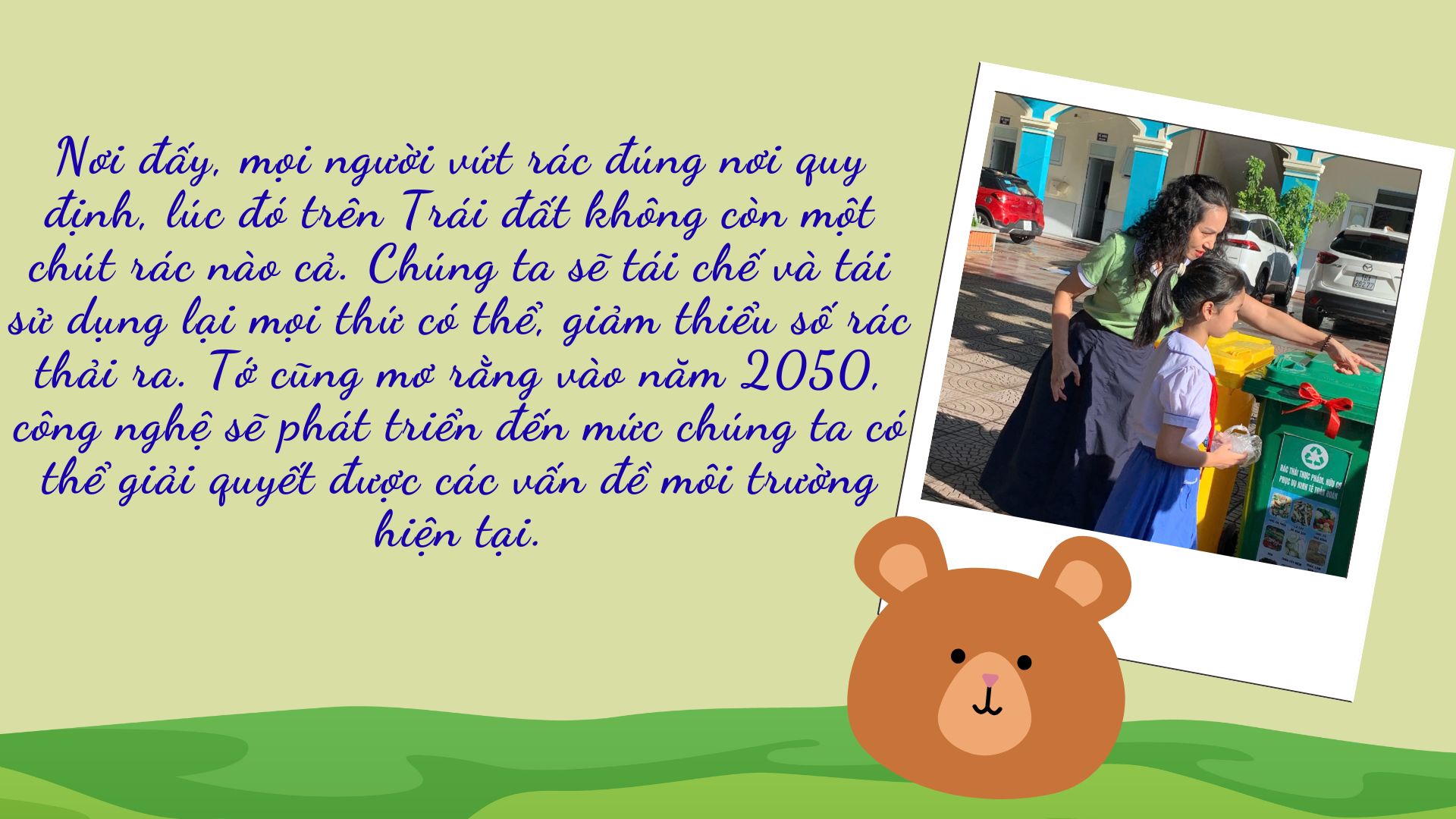 Chia sẻ uớc mơ liên quan đến năng lượng xanh, giáo dục xanh, lối sống xanh về cuộc sống xanh trên Trái đất vào năm 2050.