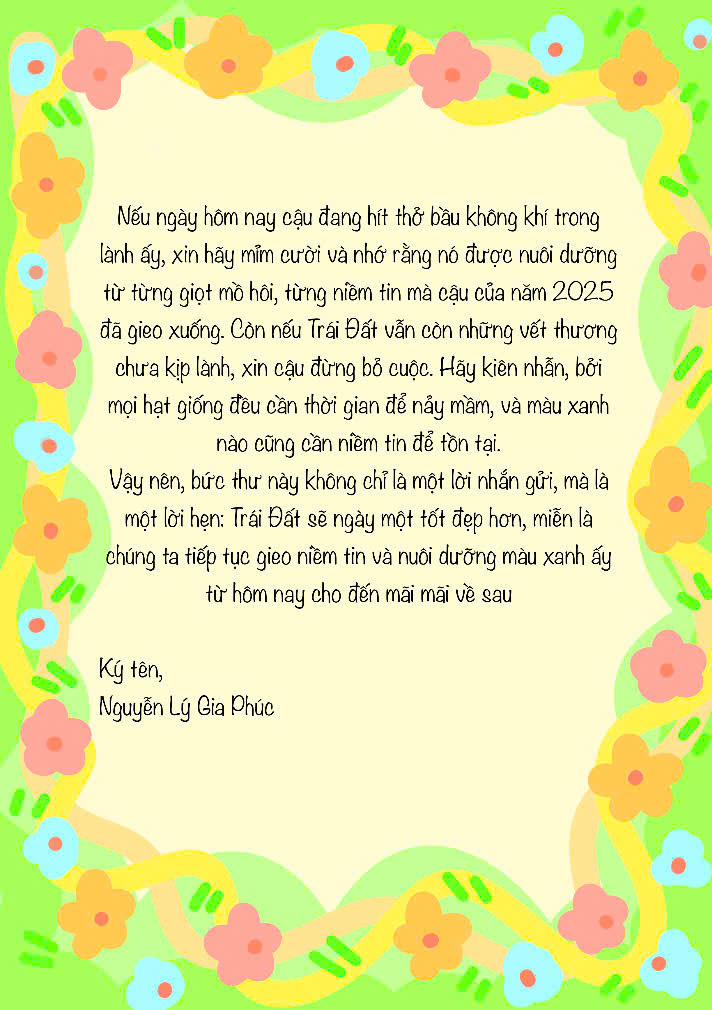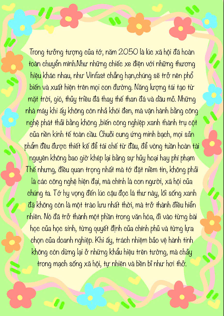 Chia sẻ uớc mơ liên quan đến năng lượng xanh, giáo dục xanh, lối sống xanh về cuộc sống xanh trên Trái đất vào năm 2050.
