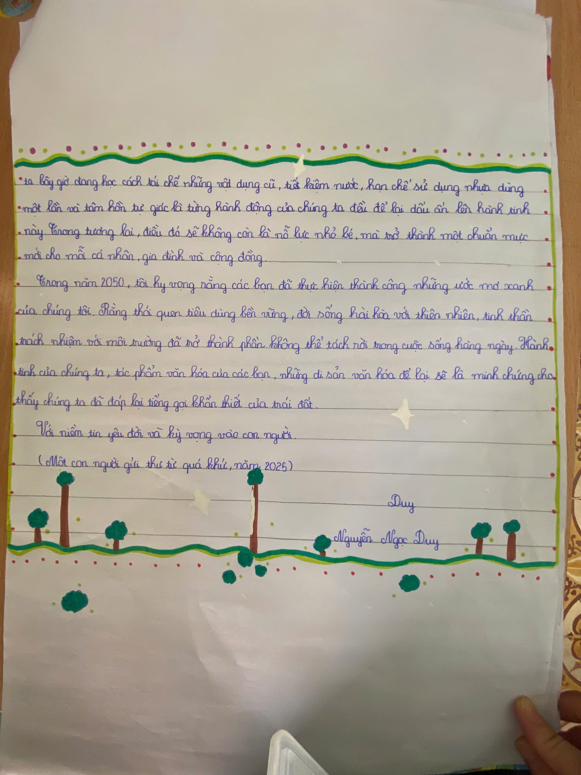 Chia sẻ uớc mơ liên quan đến năng lượng xanh, giáo dục xanh, lối sống xanh về cuộc sống xanh trên Trái đất vào năm 2050.