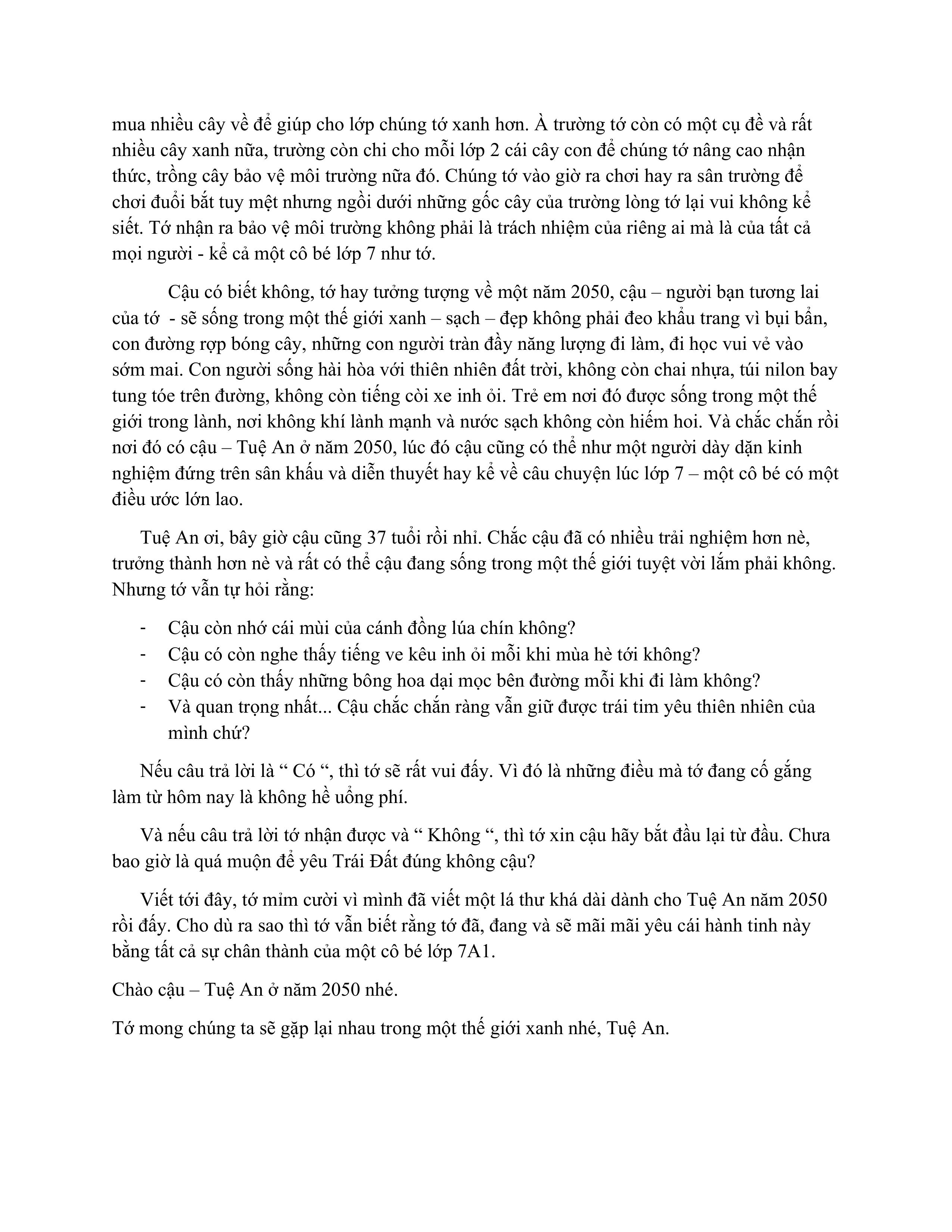 Bức thư mà con vừa viết là những tâm tư, hi vọng, những lời nhắn nhủ của con với người bạn năm 2050. Đó cũng là lời cảnh tình của mẹ thiên nhiên với nhân loại về biến đổi khí hậu trong những năm gần đây. Con mong sau khi đọc bức thư này mọi người sẽ có trách nhiệm hơn trong việc bảo vệ thiên nhiên và động vật.