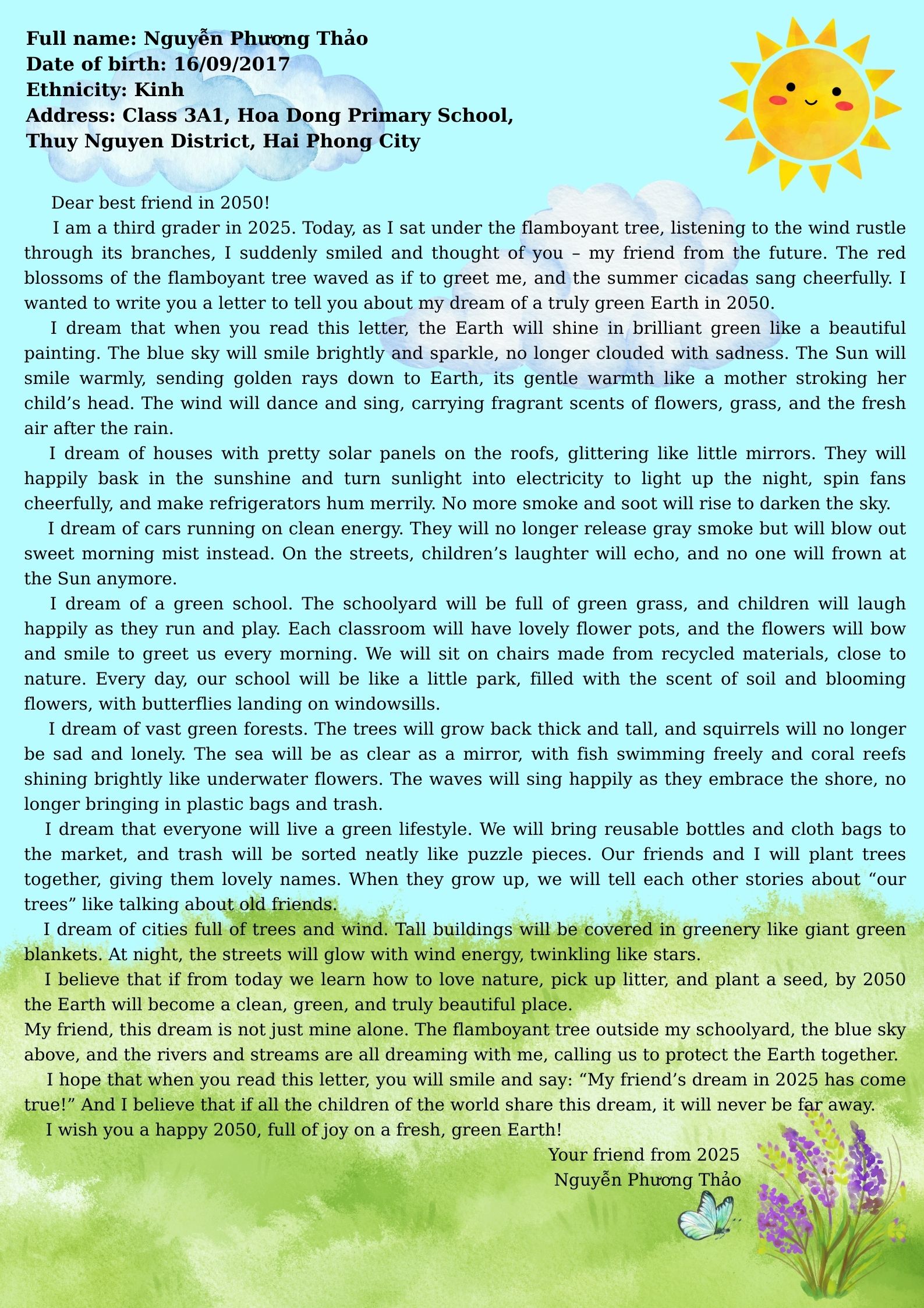 Chia sẻ uớc mơ liên quan đến năng lượng xanh, giáo dục xanh, lối sống xanh về cuộc sống xanh trên Trái đất vào năm 2050.