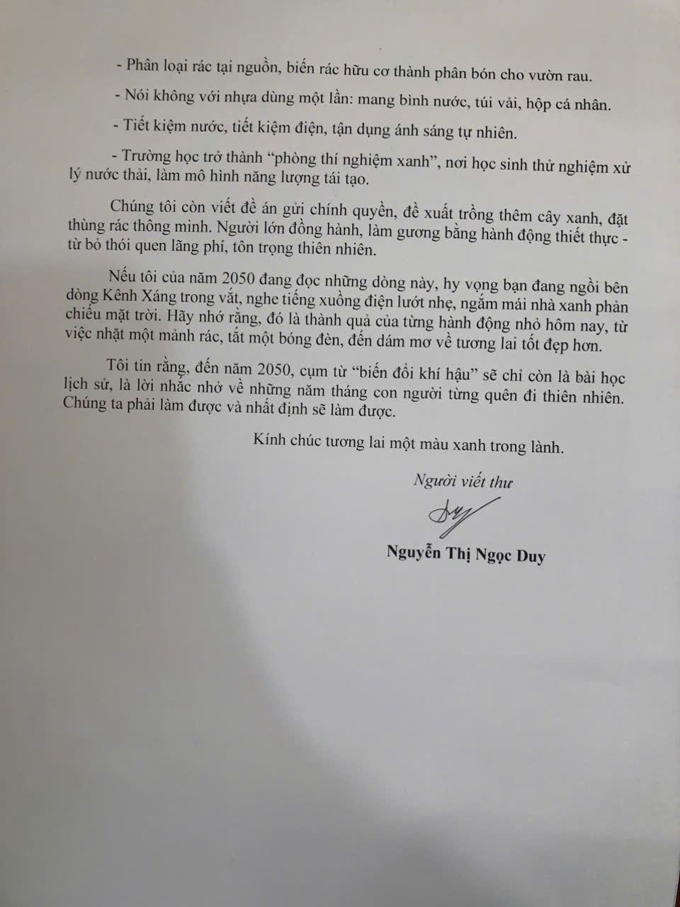 Nếu tôi của năm 2050 đang đọc những dòng này, hy vọng bạn đang ngồi bên dòng Kênh Xáng trong vắt, nghe tiếng xuồng điện lướt nhẹ, ngắm mái nhà xanh phản chiếu mặt trời. Hãy nhớ rằng, đó là thành quả của từng hành động nhỏ hôm nay, từ việc nhặt một mảnh rác, tắt một bóng đèn, đến dám mơ về tương lai tốt đẹp hơn.