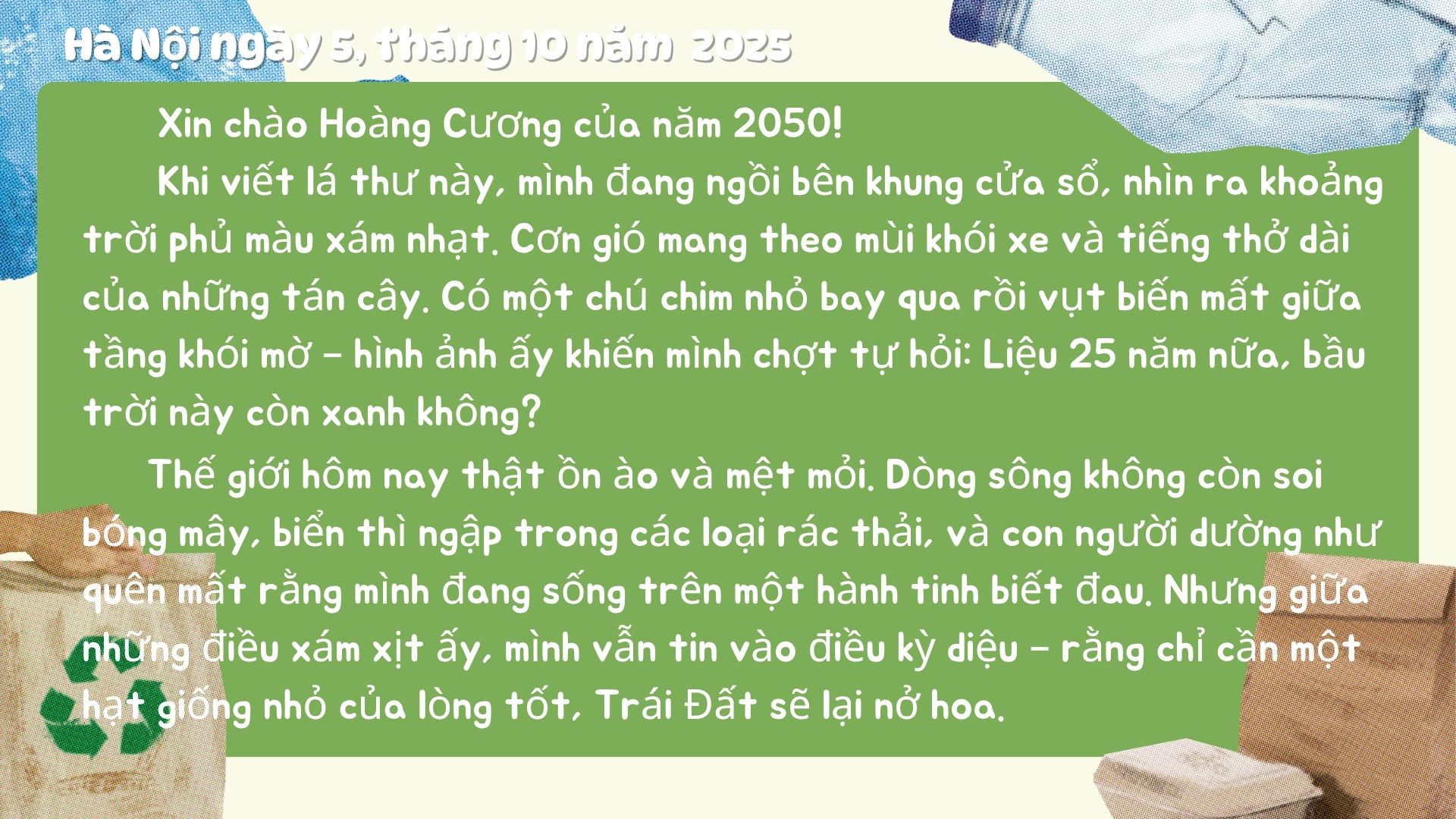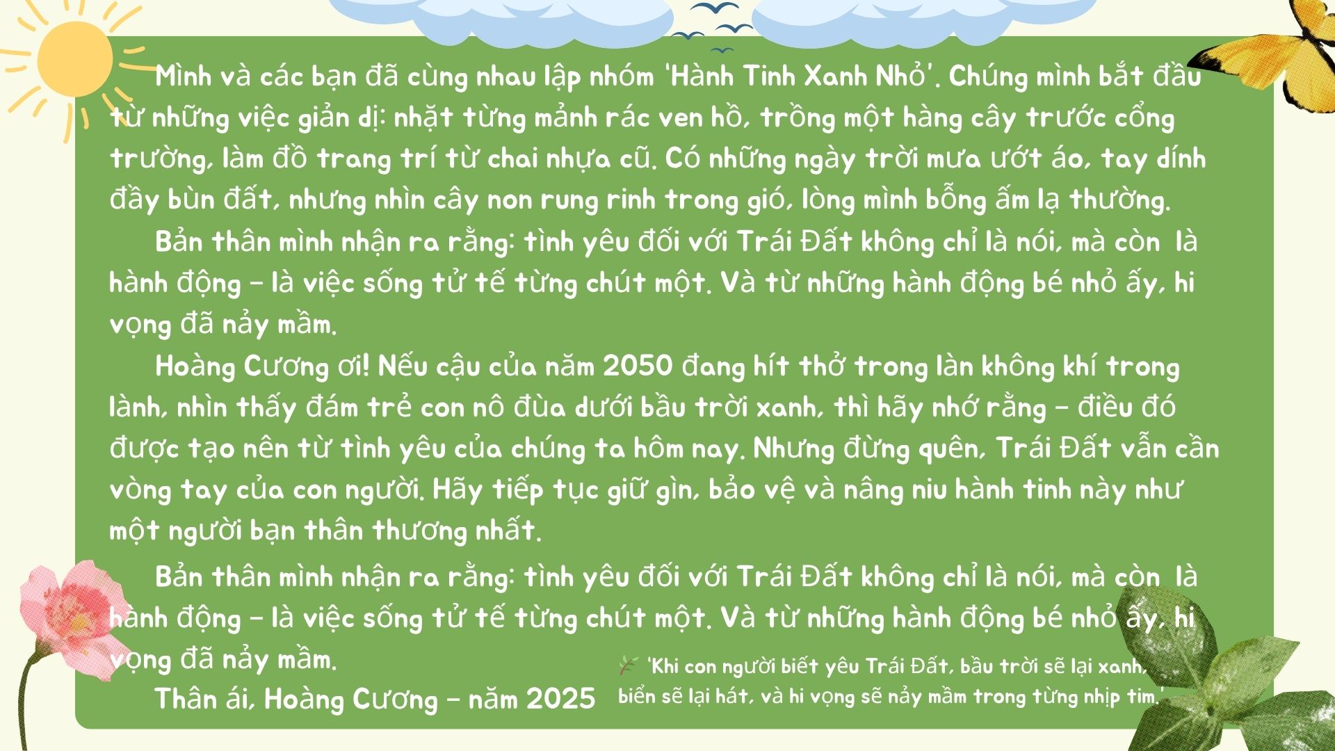 Đứng trước sự bất thường của việc thời tiết thay đổi, thiên tai lũ lụt xảy ra một cách thường xuyên. Bản thân tôi nhận thấy rằng mình cũng cần góp chút sức bé nhỏ trong hành trình bảo vệ thiên nhiên. Đồng thời, dường như mẹ thiên nhiên cũng đang giận dữ vì những hành vi thiếu ý thức bảo vệ môi trường của nhiều cá nhân trong cuộc sống hàng ngày. Vì vậy, mỗi chúng ta cần chung tay góp sức khắc phục các hậu quả do con người gây ra để bảo vệ hệ sinh thái tự nhiên trên Trái Đất.