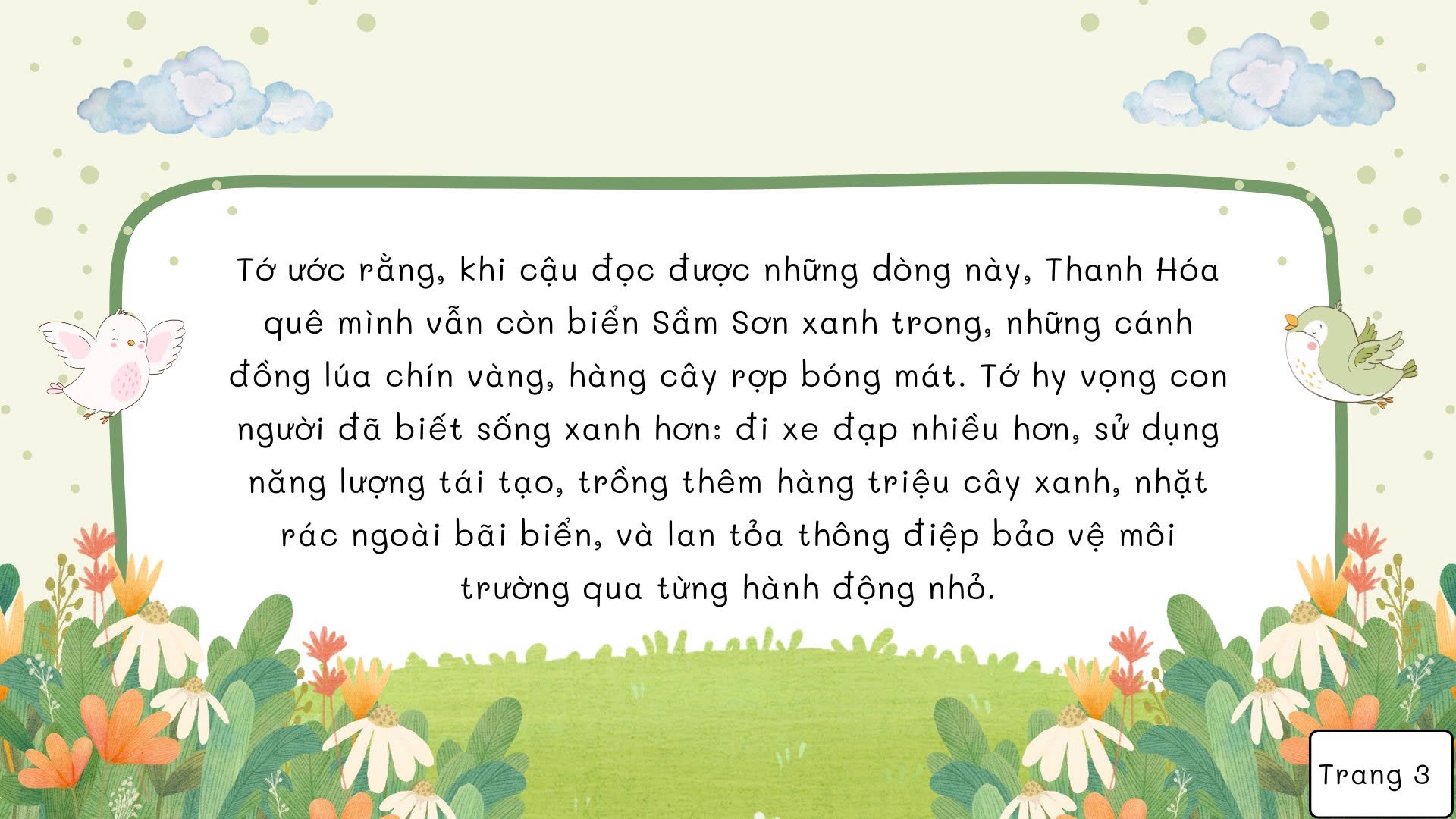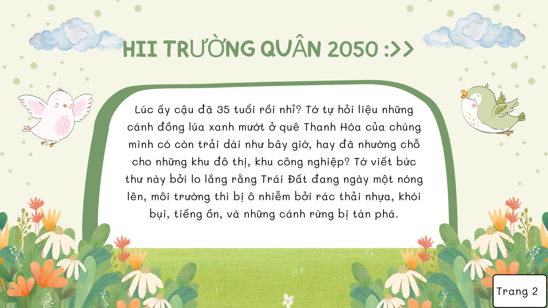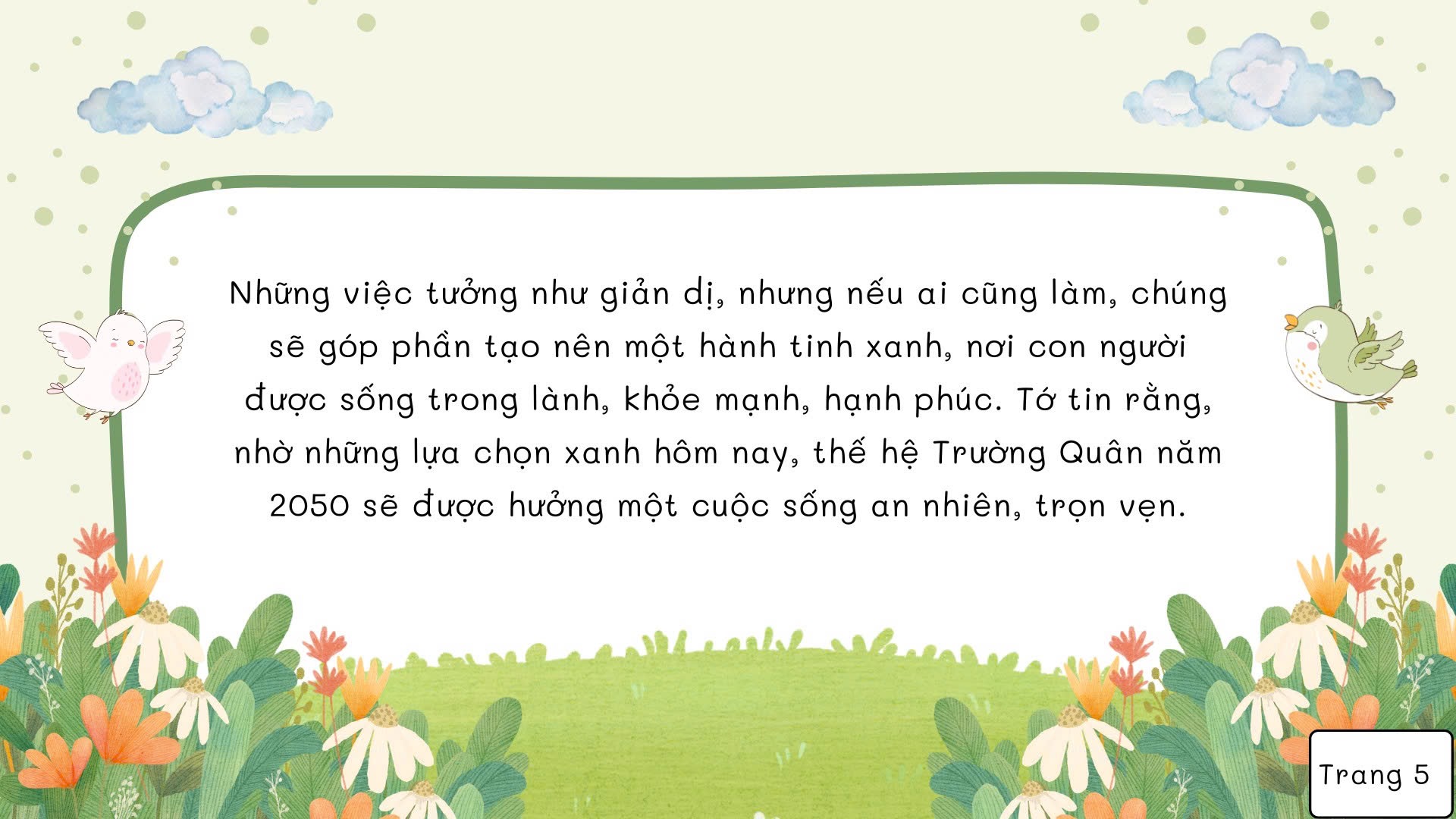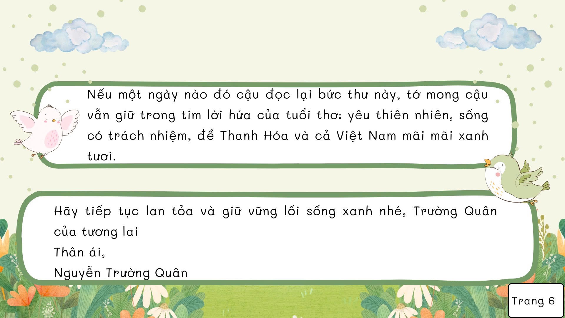 Trường Quân của năm 2050 với nỗi niềm lo lắng về biến đổi khí hậu, ô nhiễm và thiên nhiên bị tàn phá, đồng thời bày tỏ ước mong quê hương Thanh Hóa vẫn xanh tươi với biển, đồng lúa và hàng cây. Con hy vọng mọi người sống xanh hơn qua những hành động nhỏ như trồng cây, đi xe đạp, nhặt rác… để xây dựng hành tinh trong lành, giúp thế hệ tương lai được sống an nhiên, hạnh phúc và luôn giữ lời hứa yêu thiên nhiên, sống có trách nhiệm.