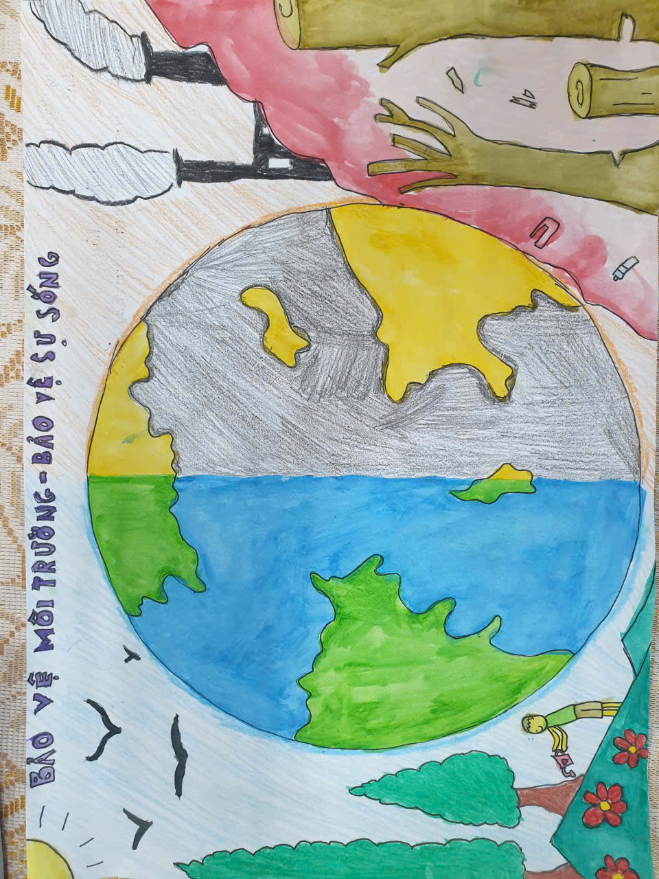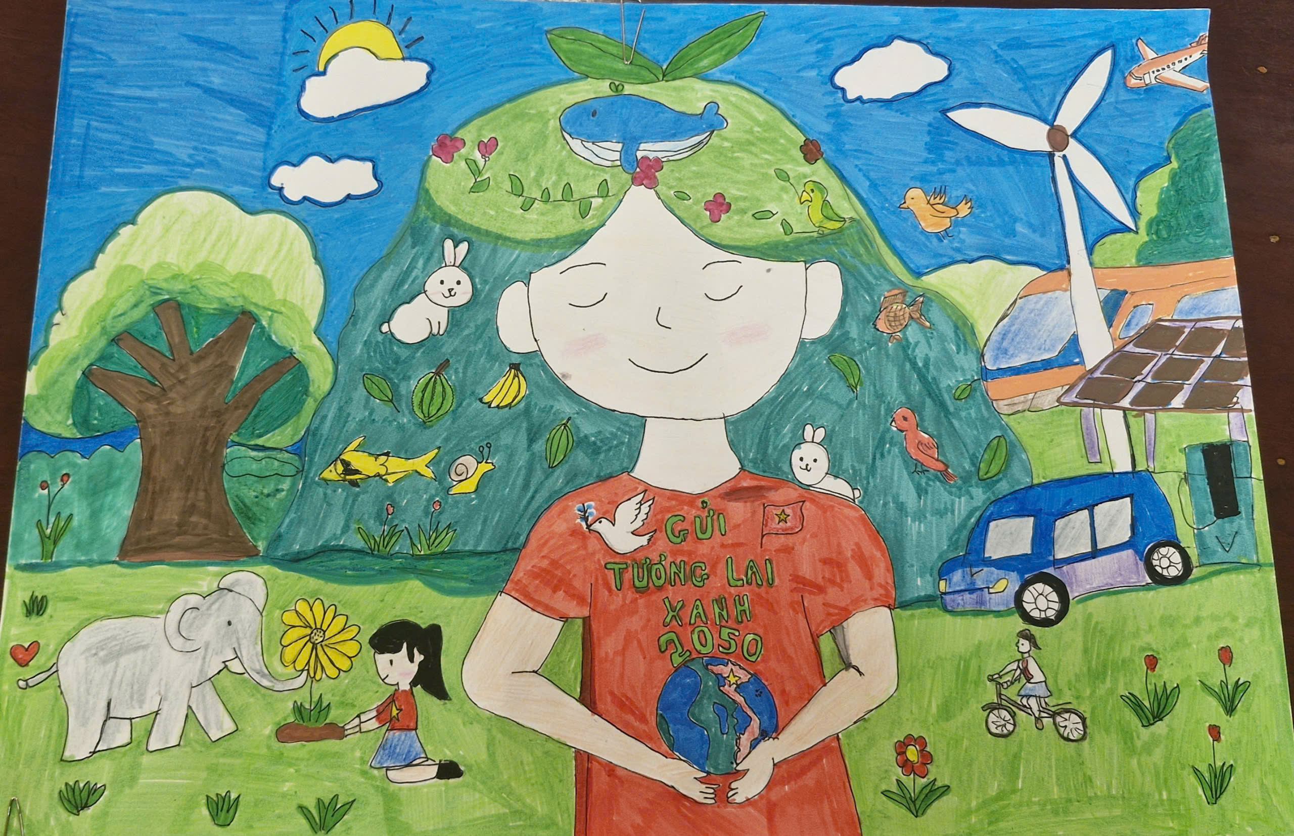 Chào các bạn! Con là Tường Vy. Con vẽ một bức tranh, một nửa là bây giờ, một nửa là ước mơ của con về năm 2050 đó! Nhìn vào bức tranh con thấy bây giờ buồn quá! Trời thì xám xịt, đầy mây giông sấm sét. Cây cối trơ trụi, khô héo hết cả. Rác thải thì vứt lung tung, có cả những chiếc xe bị cháy nữa. Các cô chú, anh chị thì cãi nhau, giằng co, đánh nhau nữa. Trông ai cũng giận dữ và không vui vẻ chút nào. Con không thích thế giới này một chút nào hết! Có những nơi trên thế giới xảy ra chiến tranh, giết chóc rất khổ các vũ khí loại lớn hạt nhân gây độc hại và ô nhiễm môi trường ảnh hưởng bầu khí quyển và sức khoẻ con người. Nửa phía trên bức tranh của con là ước mơ của con về Tương Lai Xanh năm 2050 đó! Trời xanh ngắt, có những đám mây trắng bồng bềnh và ông mặt trời thì đang cười thật tươi. Xung quanh quả địa cầu, cây cối xanh um tùm, có cả những thùng rác để mọi người bỏ rác đúng chỗ nữa! Các bạn nhỏ thì đang vui vẻ chơi đùa,có bạn đang tưới cây, có bạn còn vuốt ve cả những con vật đáng yêu như thỏ, nai nữa chứ! Ai cũng cười thật tươi, nắm tay nhau thật chặt, yêu thương và giúp đỡ lẫn nhau. Con còn thấy có cả những chú chim đang bay lượn trên bầu trời xanh.Mọi thứ thật trong lành và hạnh phúc! Con nghĩ đây là một môi trường ko những con mà rất nhiều các bạn nhỏ như con mơ ước ở 1 tương lai gần.Con ước gì đến năm 2050, thế giới của mình sẽ thật sự được như thế này! Con muốn mọi người cùng nhau bảo vệ Trái Đất, để tất cả chúng ta có một Tương Lai Xanh thật đẹp, thật bình yên và hạnh phúc! Ở nơi đó chỉ có những điều hạnh phúc mọi người cùng thay đổi, sửa đổi nhớ truyền thống cội nguồn và tiếp thu chọn lọc điều mới có ích để được sống trong môi trường xanh trong lành và hạnh phúc, nơi luôn có sự thương yêu đoàn kết sẻ chia cùng nhau xây dựng và bảo vệ trái đât xanh- sạch - đẹp của chúng ta.