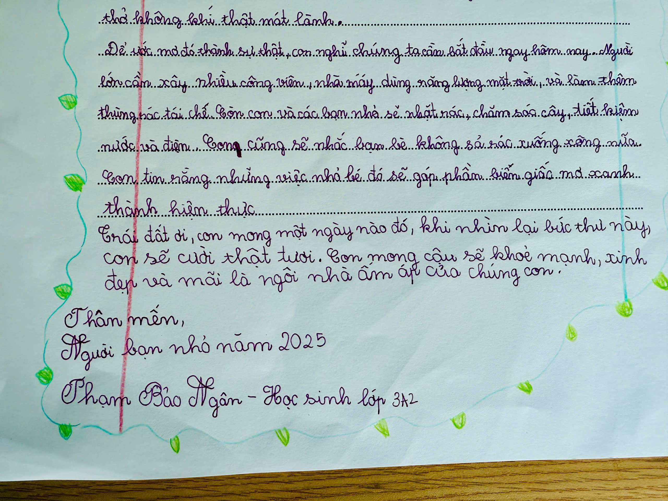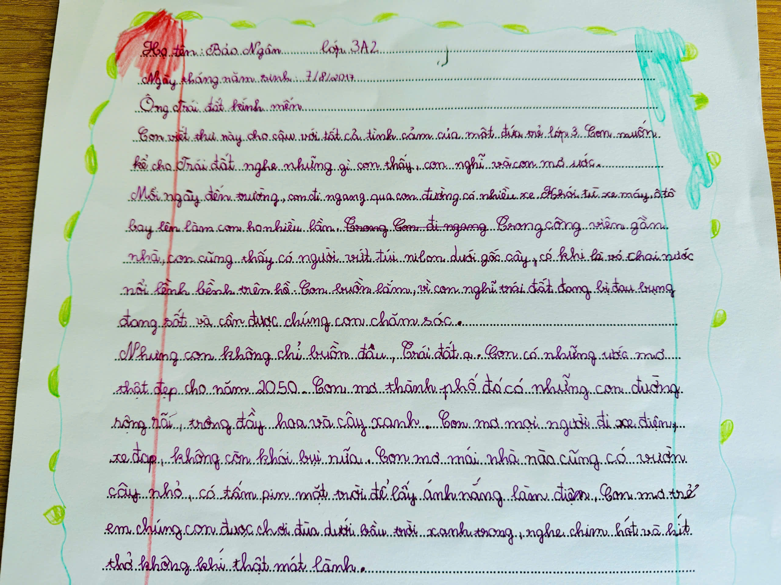 Em là Phạm Bảo Ngân, học sinh lớp 3A2 Trường Tiểu học Vinschool Gardenia. Khi viết bức thư này, em đã nghĩ về những điều em nhìn thấy mỗi ngày: khói xe trên đường làm em khó thở, rác thải nổi trên hồ trong công viên, túi nilon vứt dưới gốc cây. Em cảm giác như Trái Đất của chúng ta đang bị ốm, đang cần được yêu thương và chăm sóc.