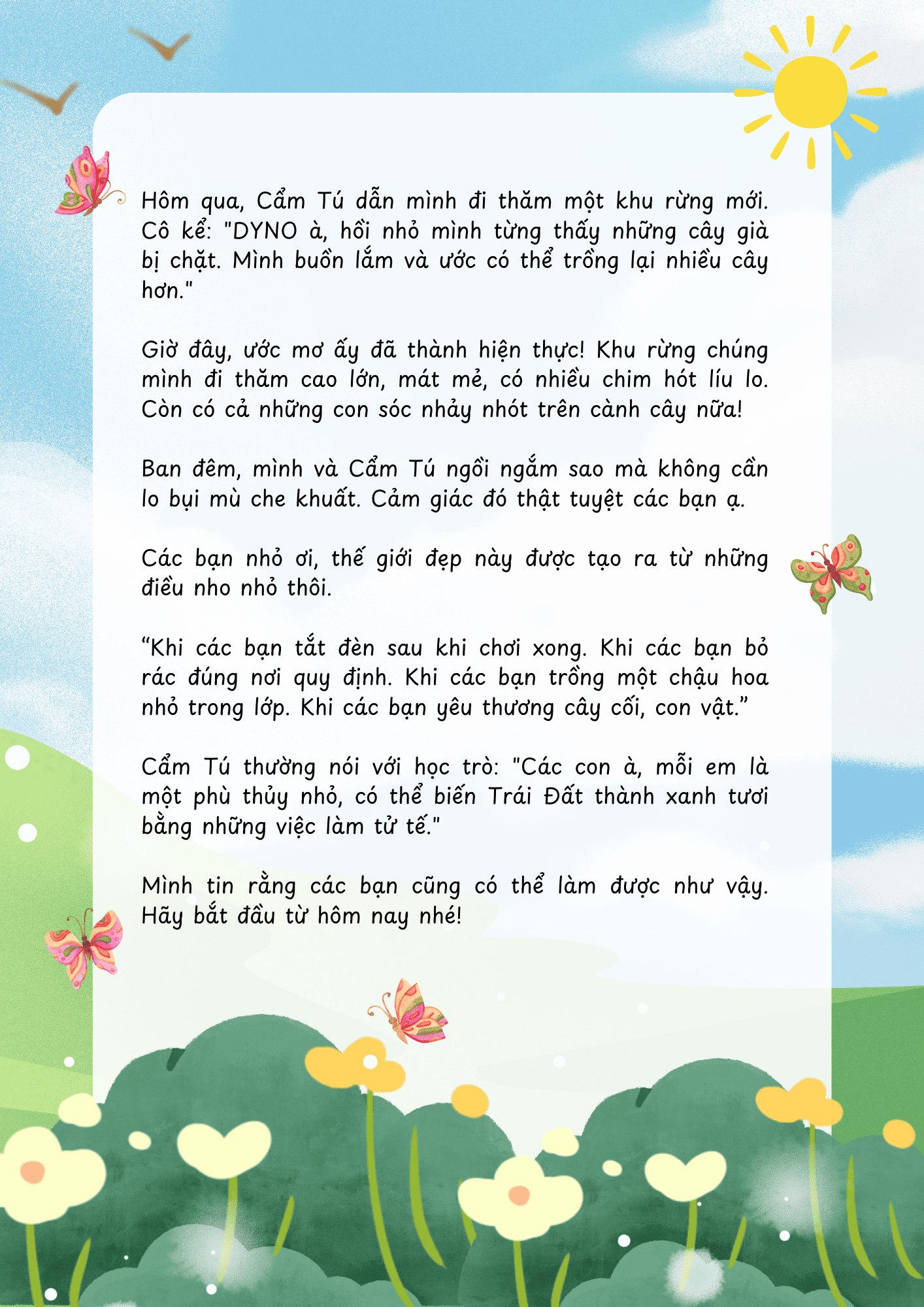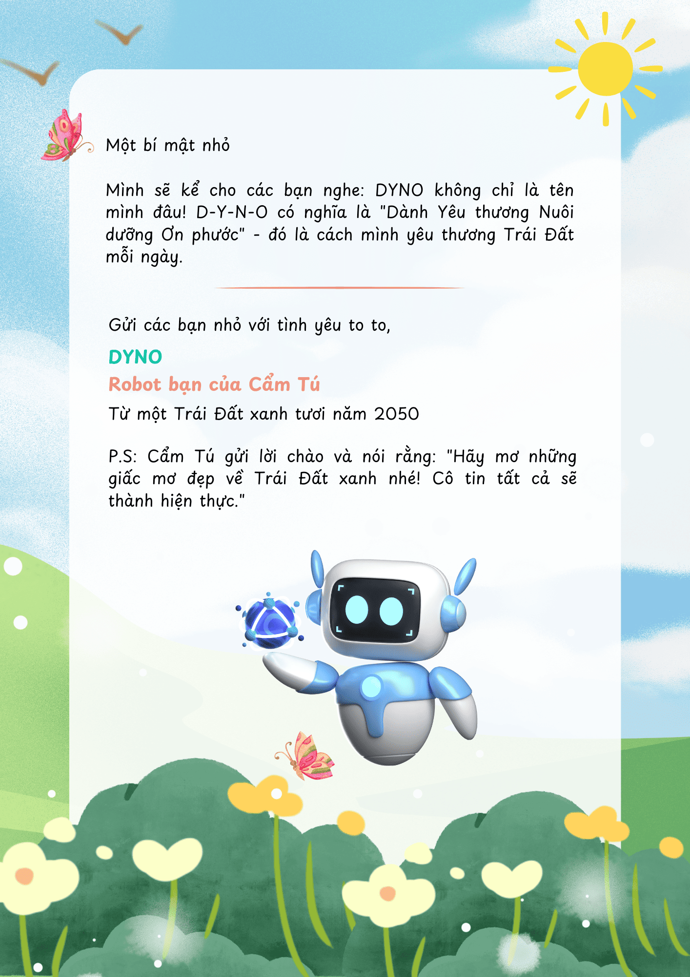 Mình là DYNO, một chú robot giống như người. Mình đang viết thư này từ năm 2050 - một thế giới rất xinh đẹp và xanh tươi!