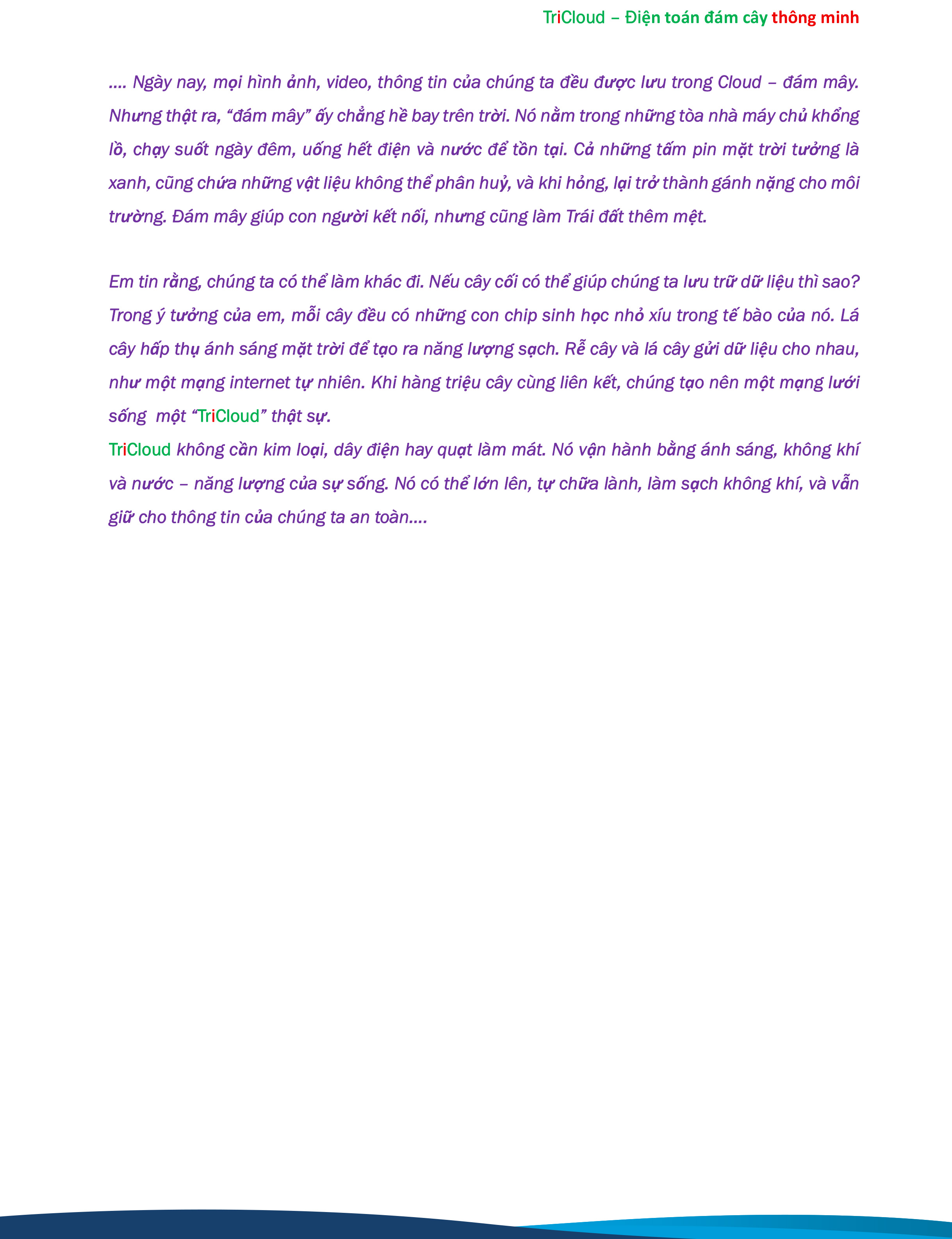 TriCloud không cần kim loại, dây điện hay quạt làm mát. Nó vận hành bằng ánh sáng, không khí và nước – năng lượng của sự sống. Nó có thể lớn lên, tự chữa lành, làm sạch không khí, và vẫn giữ cho thông tin của chúng ta an toàn….
