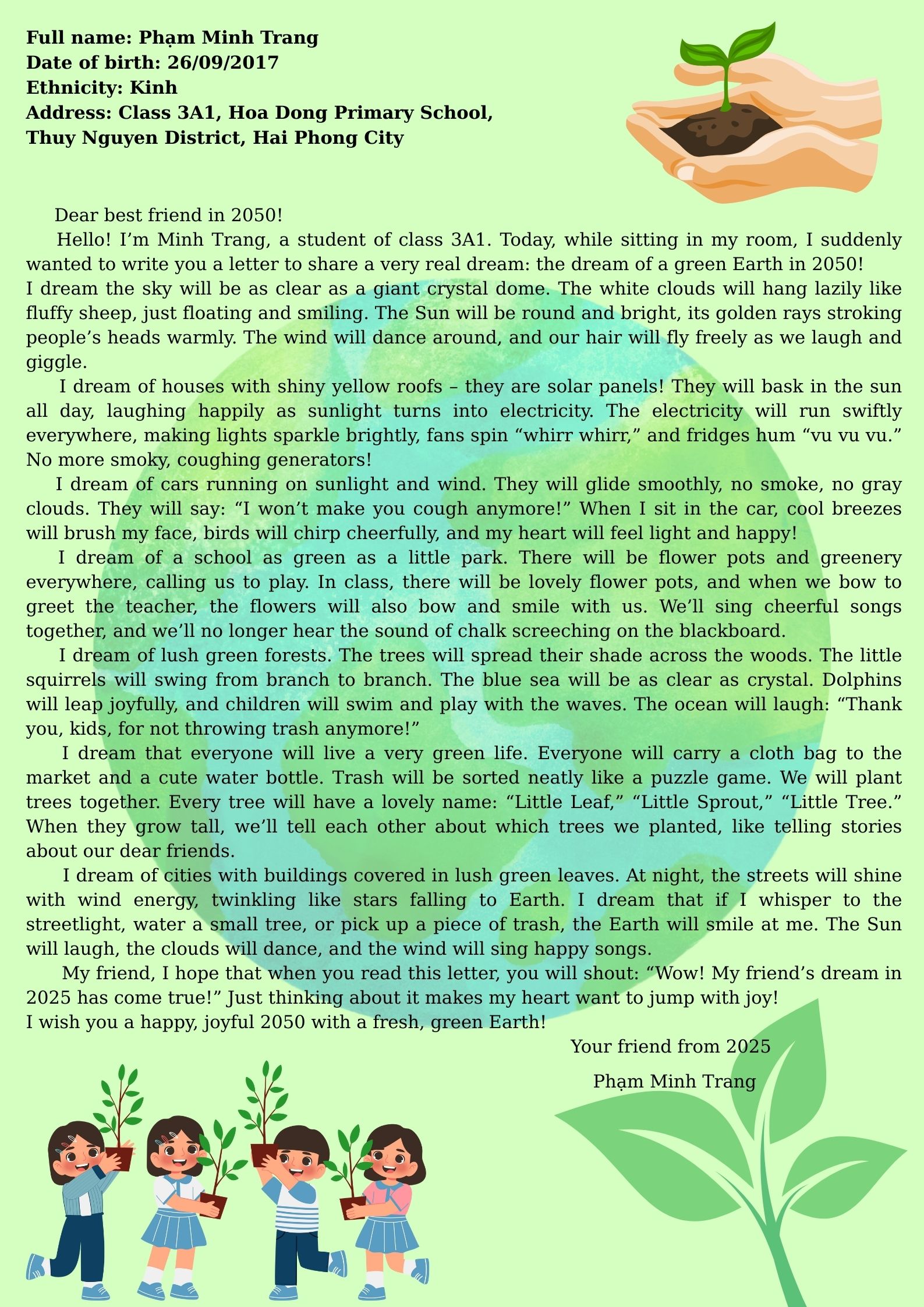 Chia sẻ uớc mơ liên quan đến năng lượng xanh, giáo dục xanh, lối sống xanh về cuộc sống xanh trên Trái đất vào năm 2050.