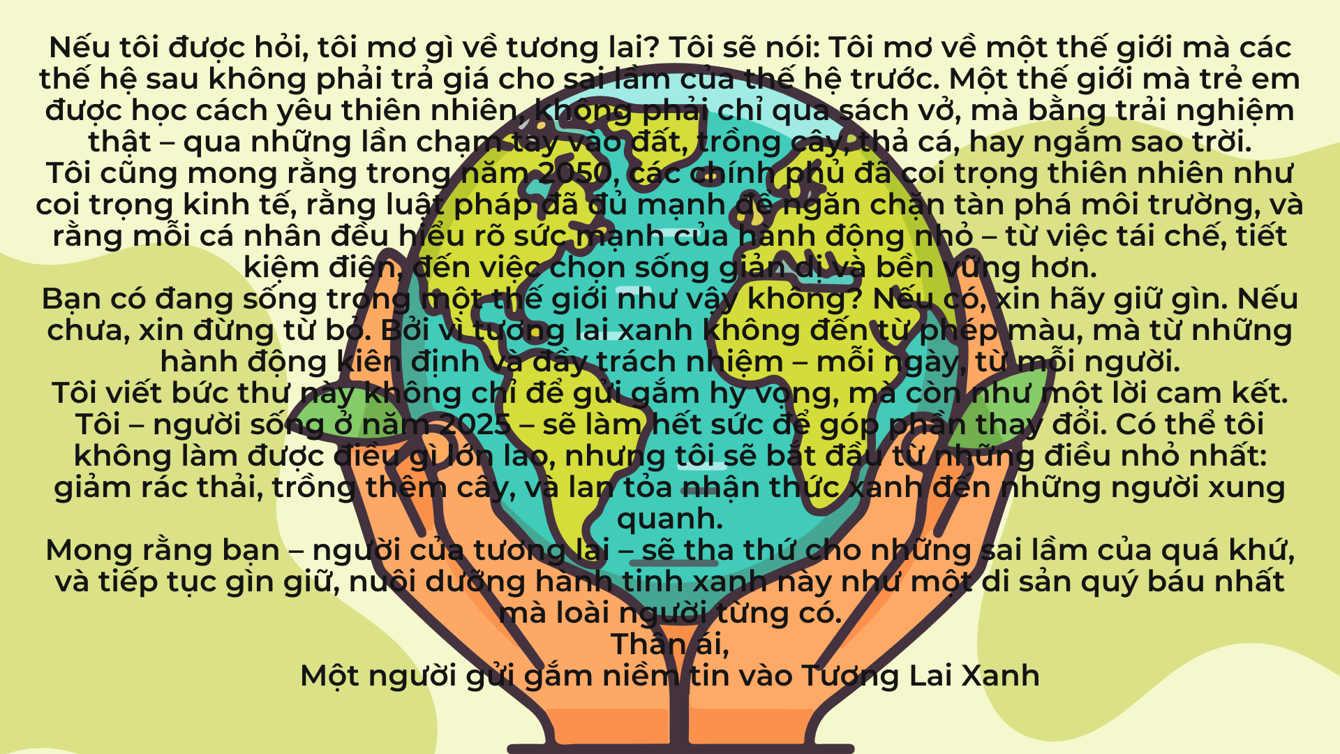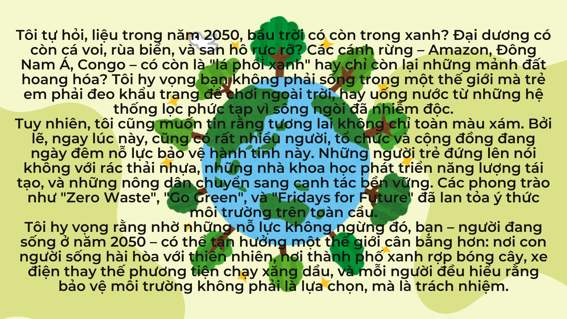 Chia sẻ uớc mơ liên quan đến năng lượng xanh, giáo dục xanh, lối sống xanh về cuộc sống xanh trên Trái đất vào năm 2050.