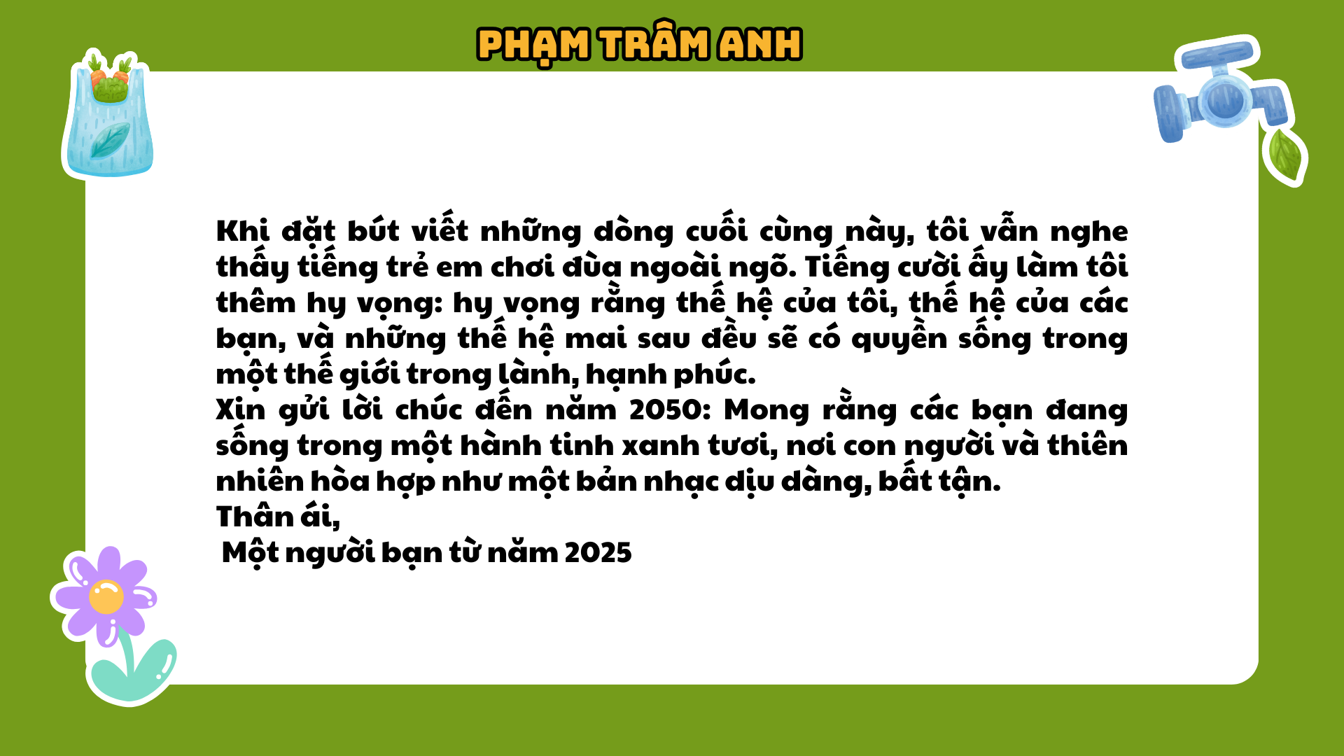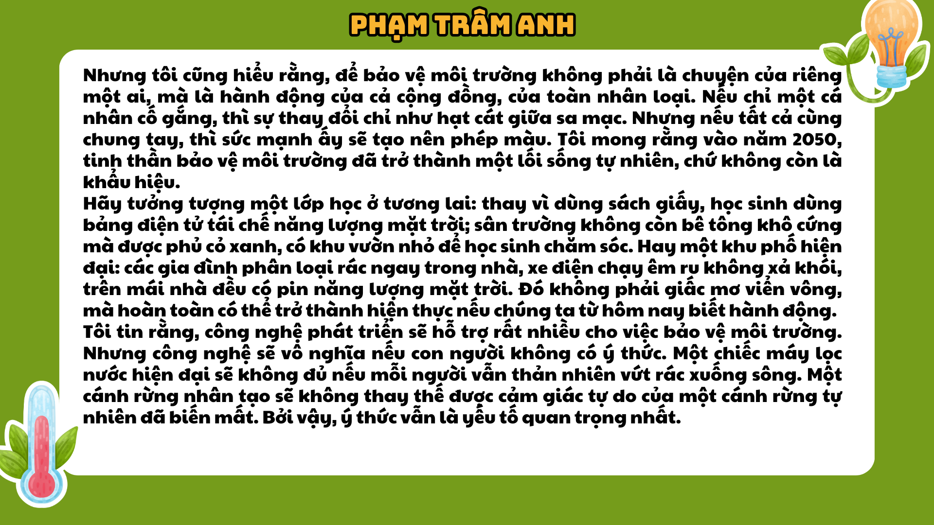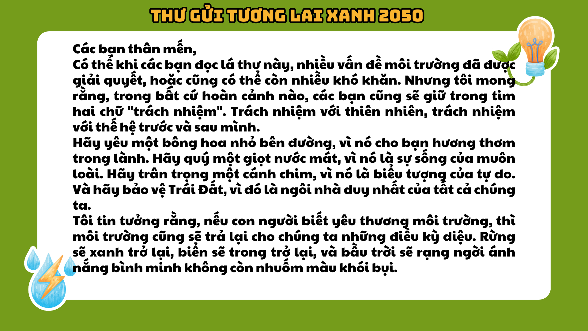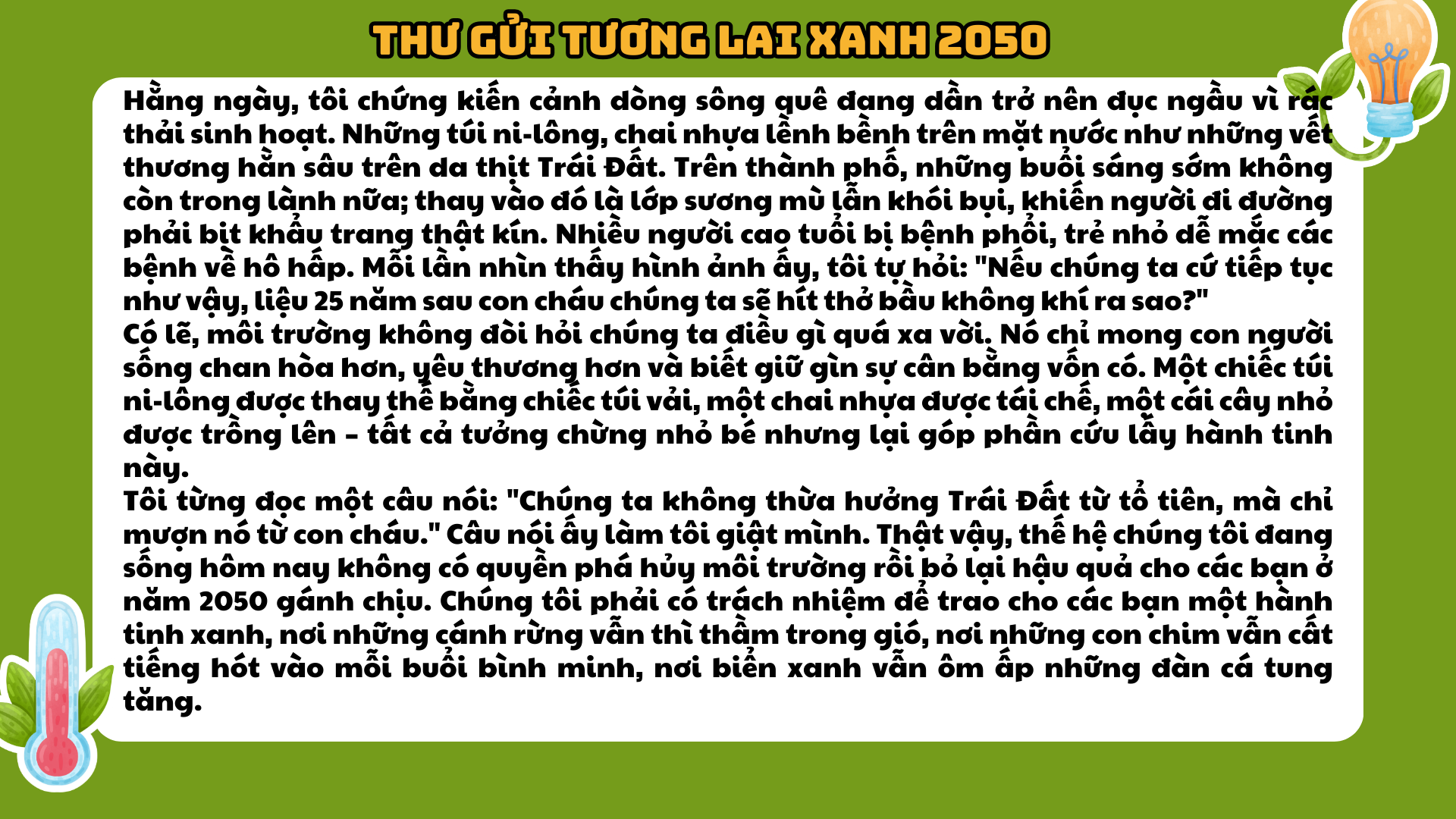 Chia sẻ uớc mơ liên quan đến năng lượng xanh, giáo dục xanh, lối sống xanh về cuộc sống xanh trên Trái đất vào năm 2050.