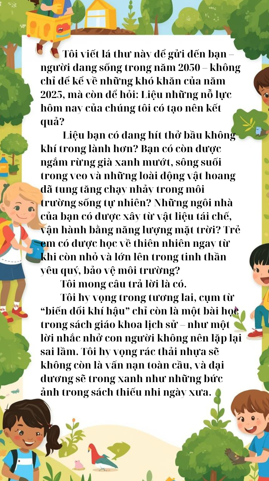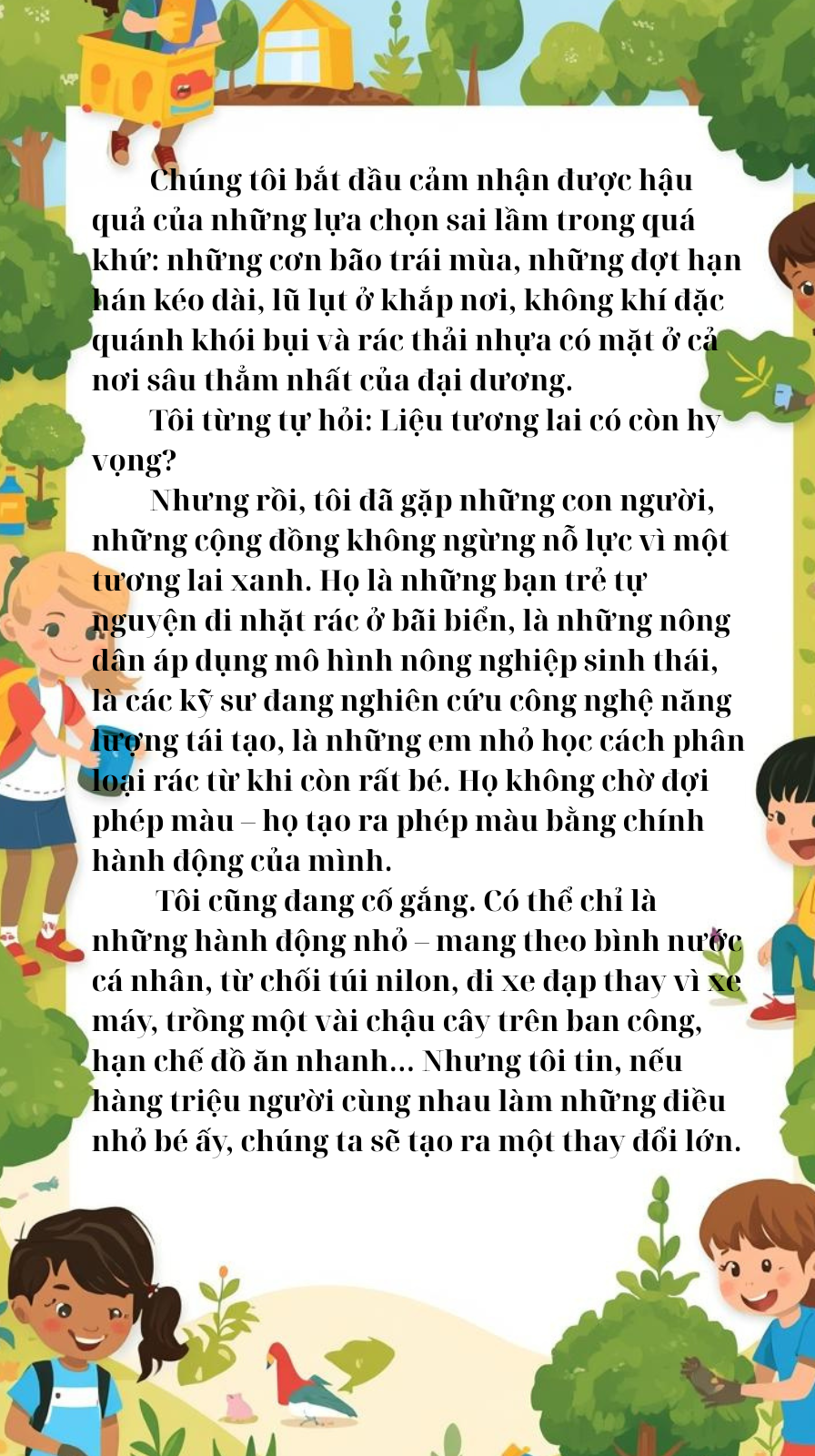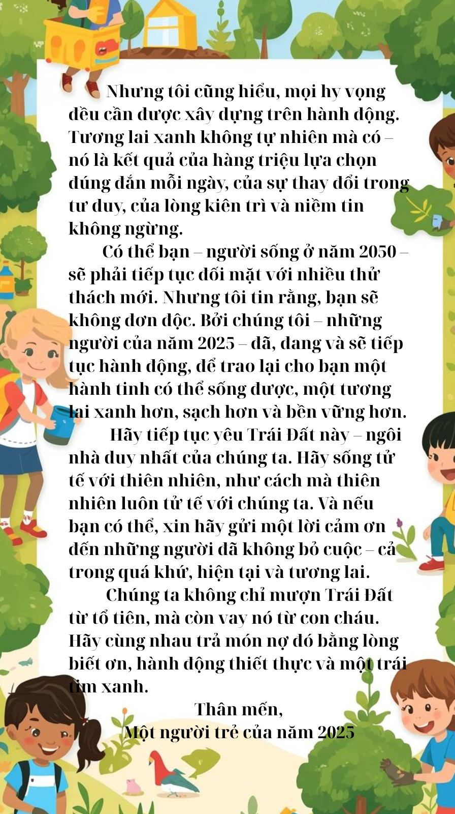 Chia sẻ uớc mơ liên quan đến năng lượng xanh, giáo dục xanh, lối sống xanh về cuộc sống xanh trên Trái đất vào năm 2050.