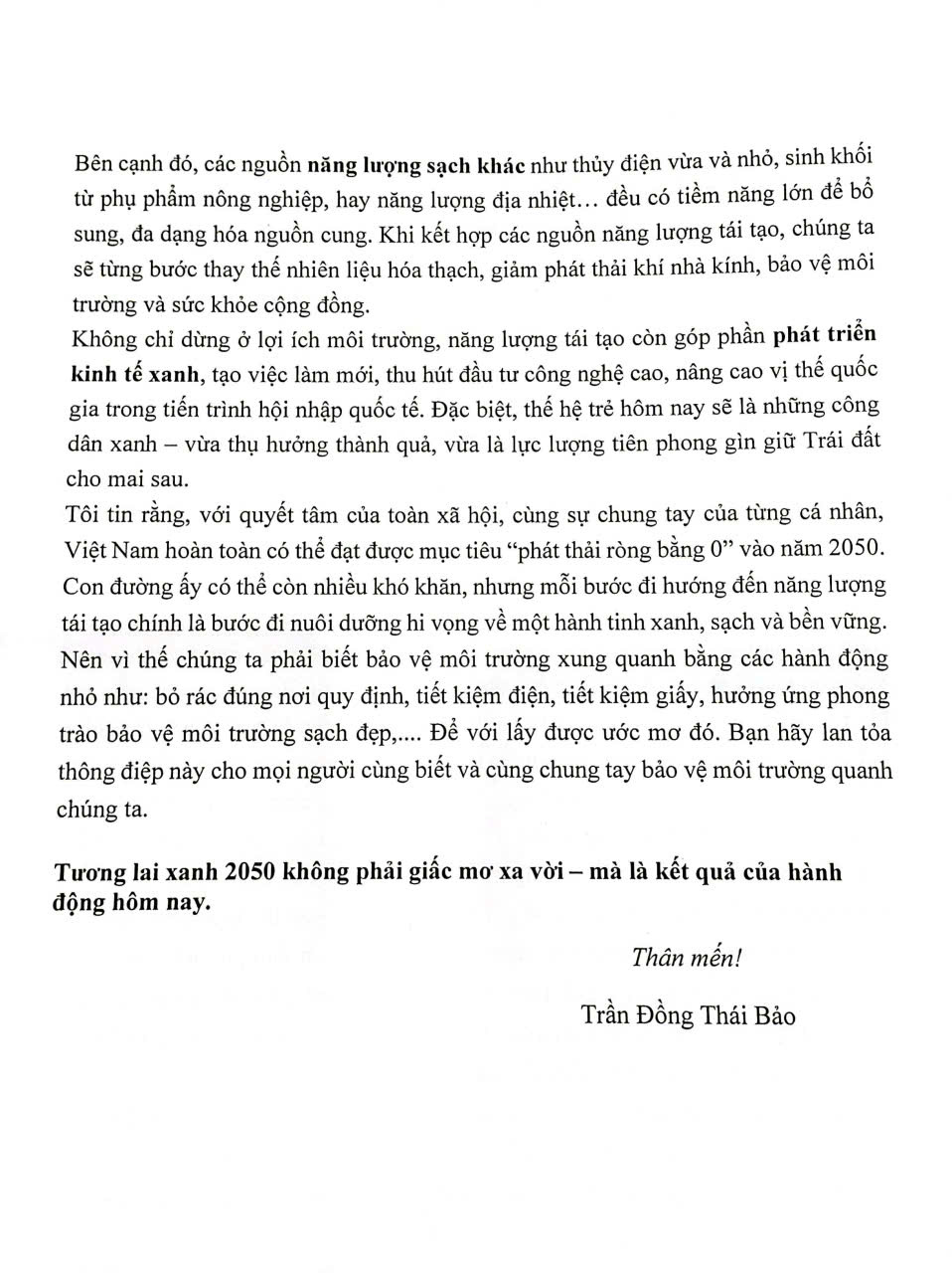 Chia sẻ uớc mơ liên quan đến năng lượng xanh, giáo dục xanh, lối sống xanh về cuộc sống xanh trên Trái đất vào năm 2050.
