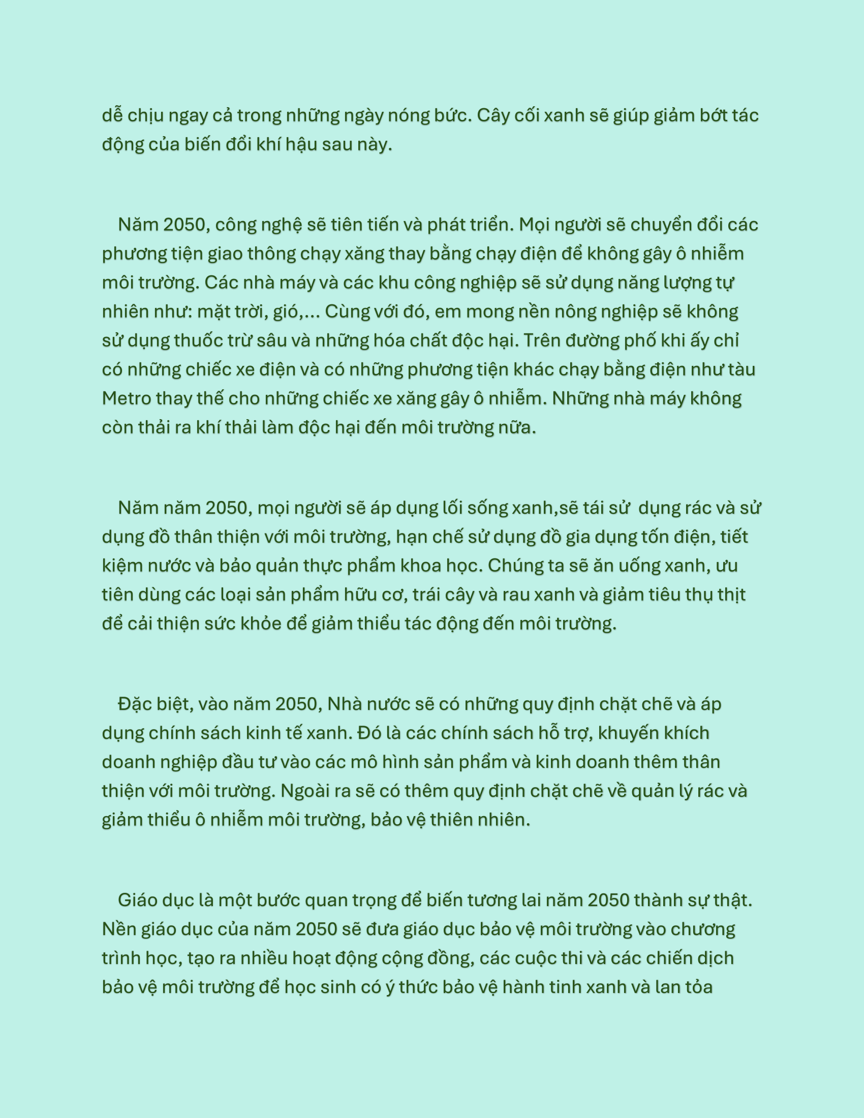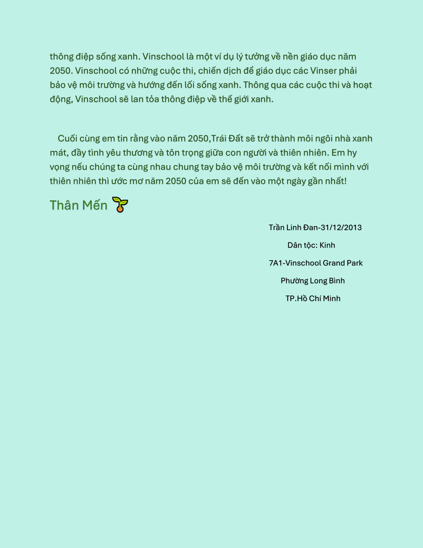 Em là Trần Linh Đan lớp 7A1,Vinschool Grand Park, em viết bức thư này để gửi cho tương lai sau này, một tương lai xanh và sạch.Trong bức thư em có đưa về những mong ước của em về một hành tinh xanh - sạch của năm 2050. Em mong bức thư này sẽ được lan tỏa đến mọi người để chúng ta chung tay bảo vệ thiên nhiên và hướng đến lối sống xanh.