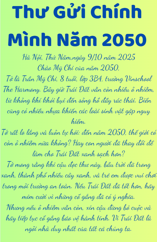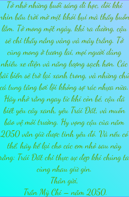 Chia sẻ uớc mơ liên quan đến năng lượng xanh, giáo dục xanh, lối sống xanh về cuộc sống xanh trên Trái đất vào năm 2050.