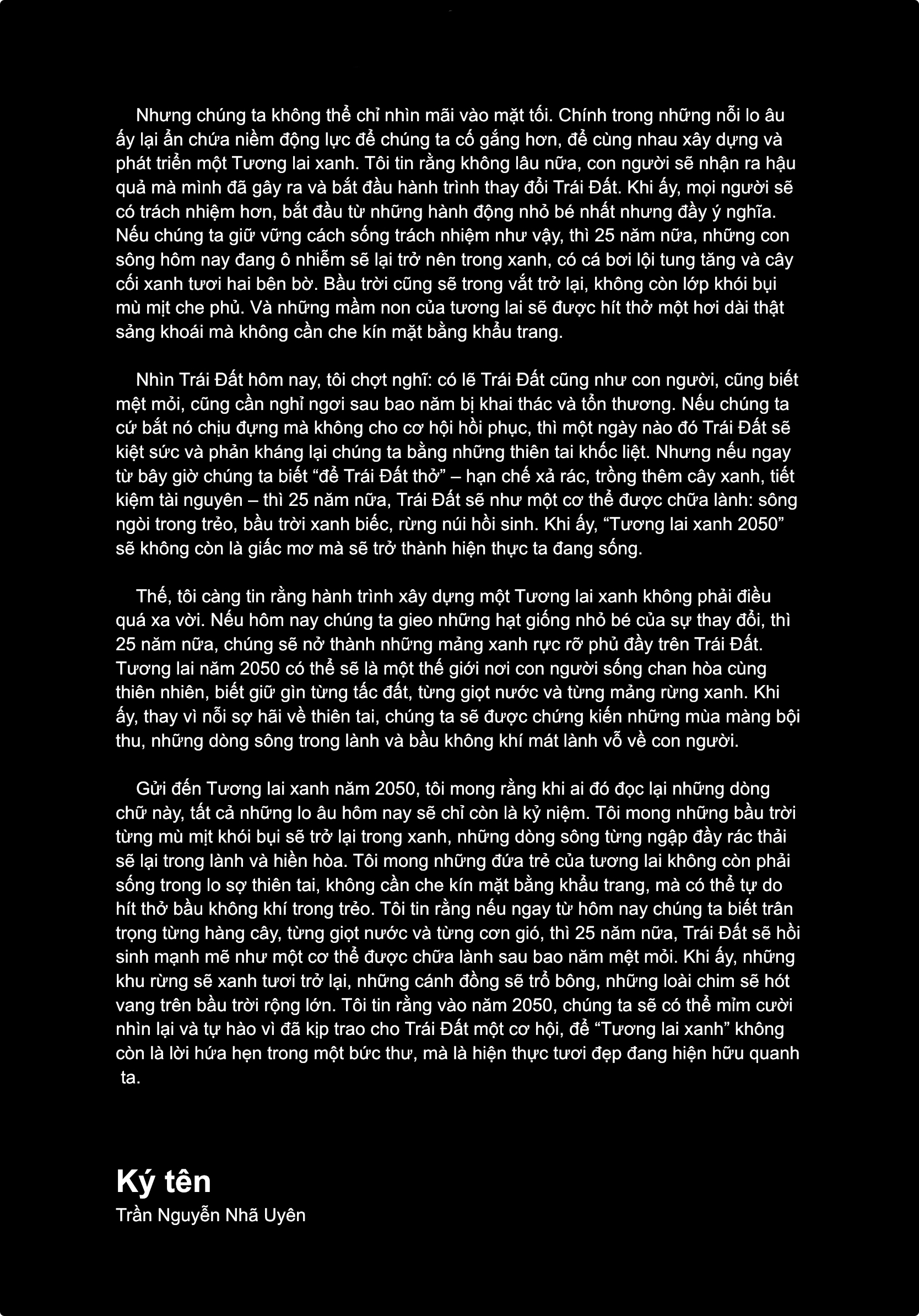 Chia sẻ uớc mơ liên quan đến năng lượng xanh, giáo dục xanh, lối sống xanh về cuộc sống xanh trên Trái đất vào năm 2050.