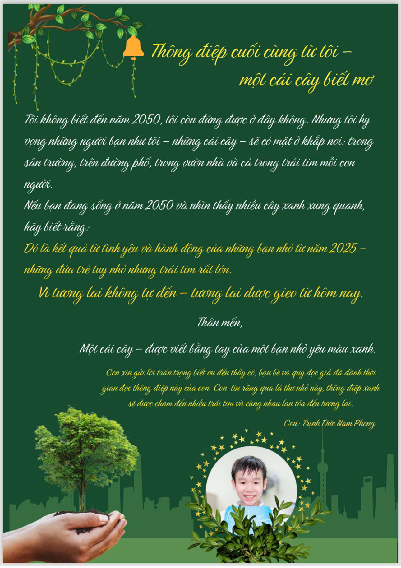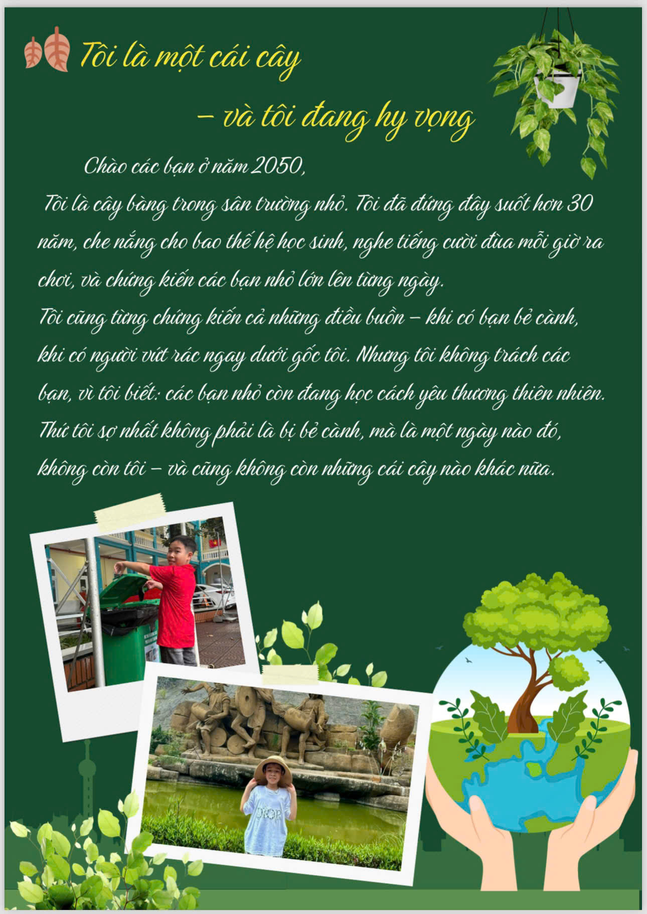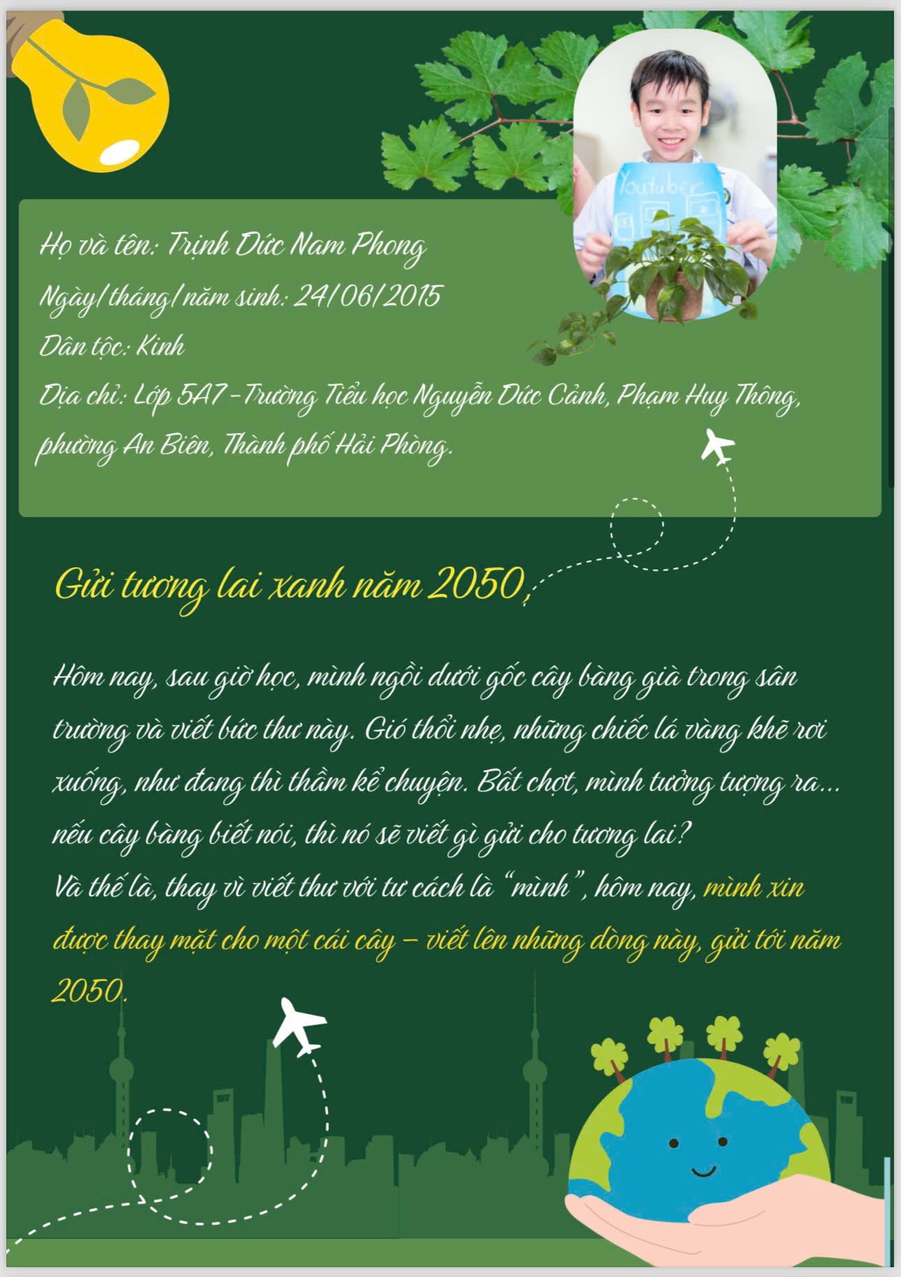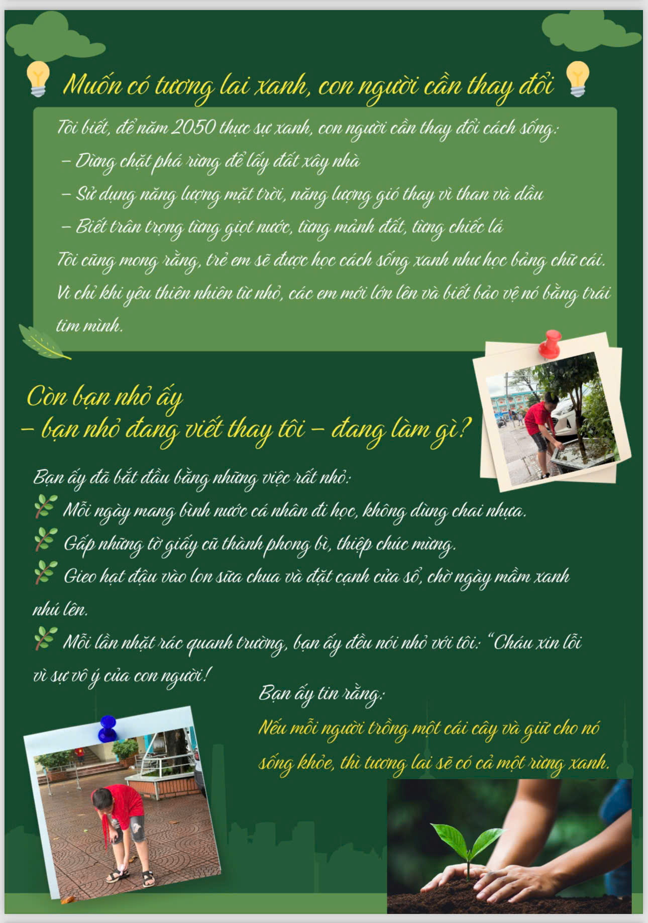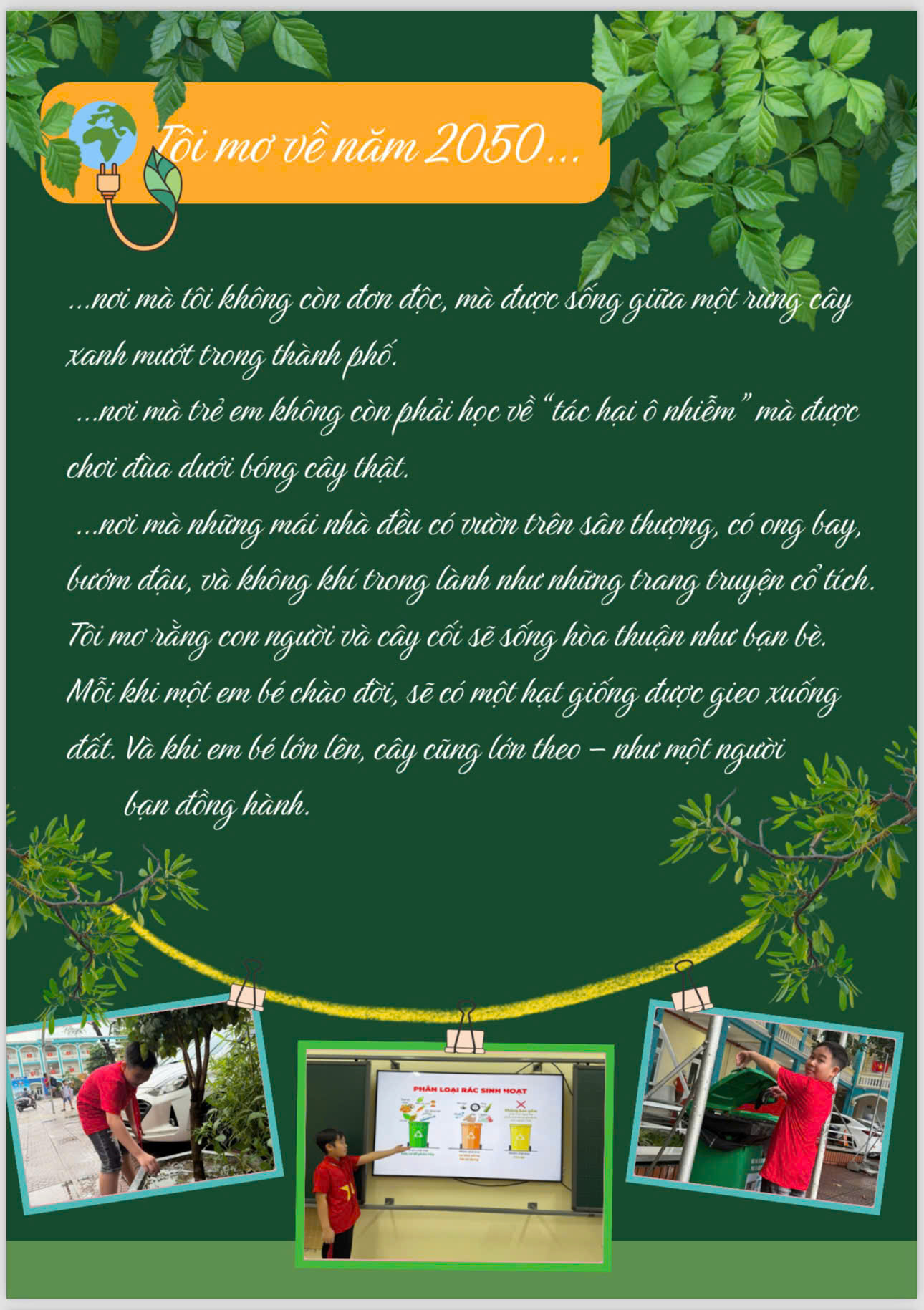 Chia sẻ uớc mơ liên quan đến năng lượng xanh, giáo dục xanh, lối sống xanh về cuộc sống xanh trên Trái đất vào năm 2050.