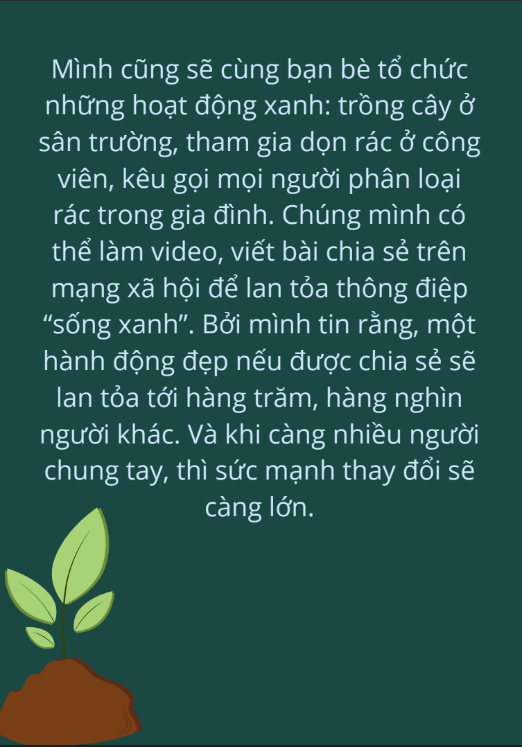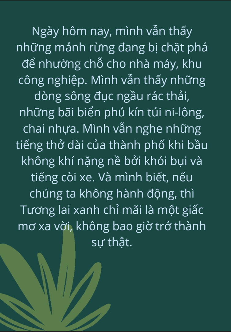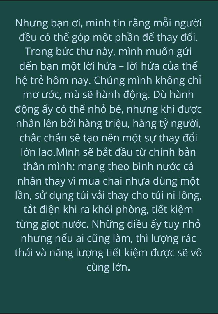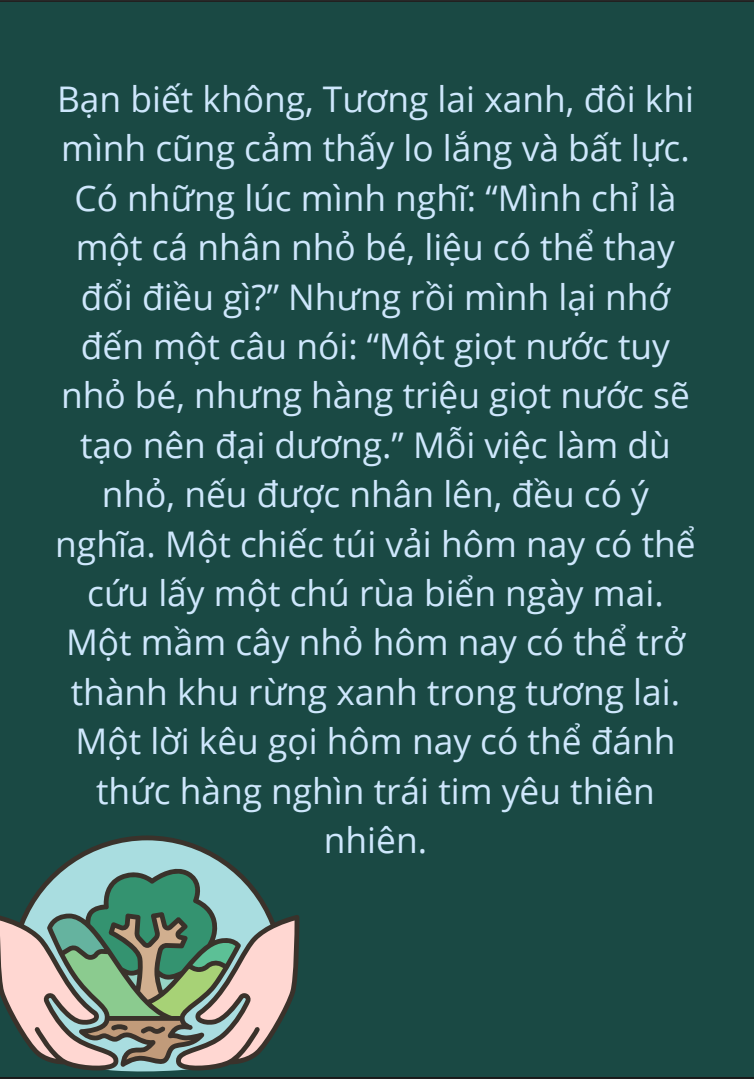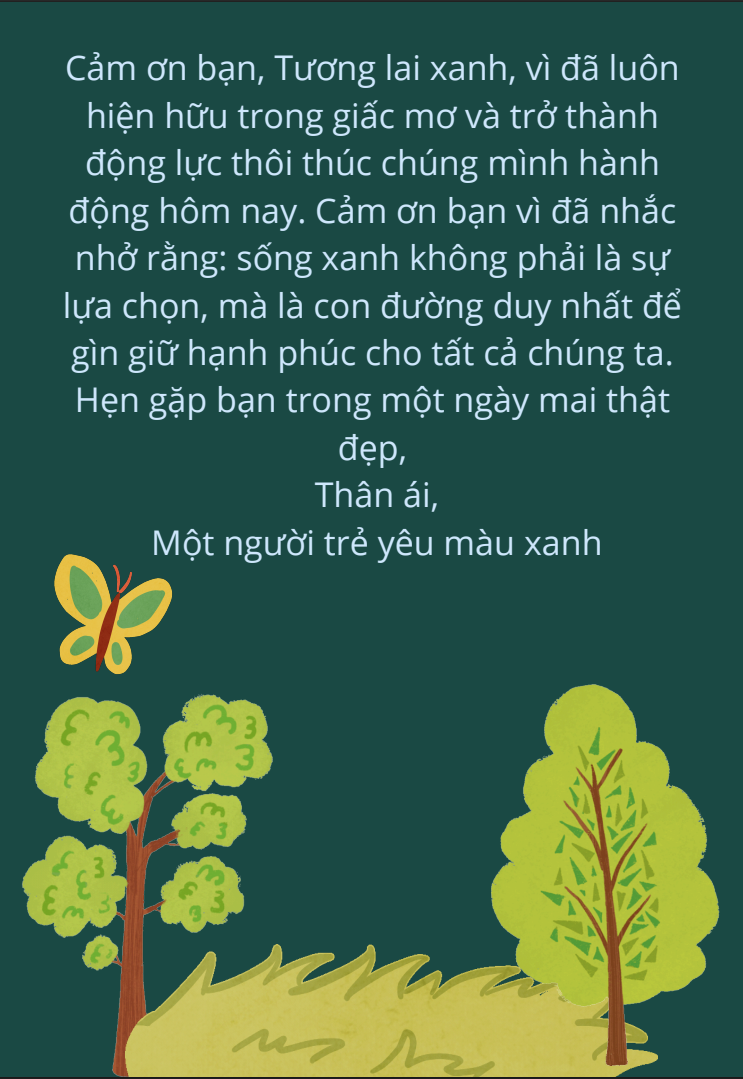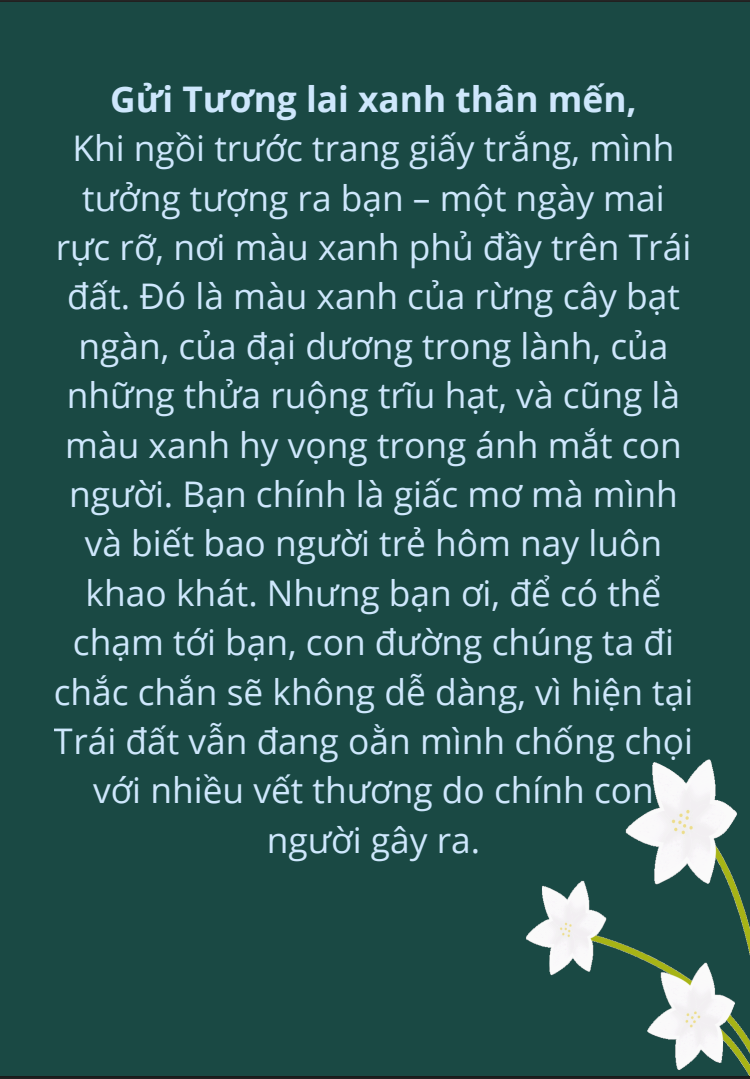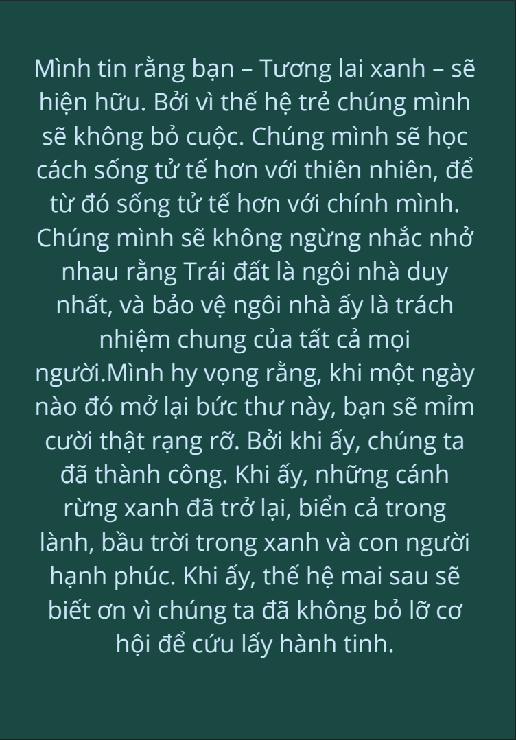 “Bức thư gửi Tương lai xanh” là lời nhắn nhủ của thế hệ trẻ hôm nay về một hành tinh xanh – sạch – đẹp. Bài viết không chỉ thể hiện ước mơ mà còn là cam kết hành động từ những việc nhỏ bé, thiết thực. Đó là thông điệp lan tỏa niềm tin rằng nếu cùng nhau nỗ lực, chúng ta sẽ biến giấc mơ xanh thành hiện thực.
