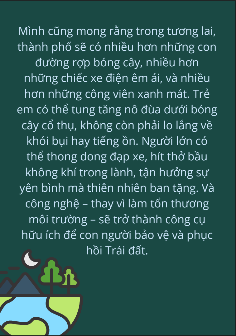 Chia sẻ uớc mơ liên quan đến năng lượng xanh, giáo dục xanh, lối sống xanh về cuộc sống xanh trên Trái đất vào năm 2050.