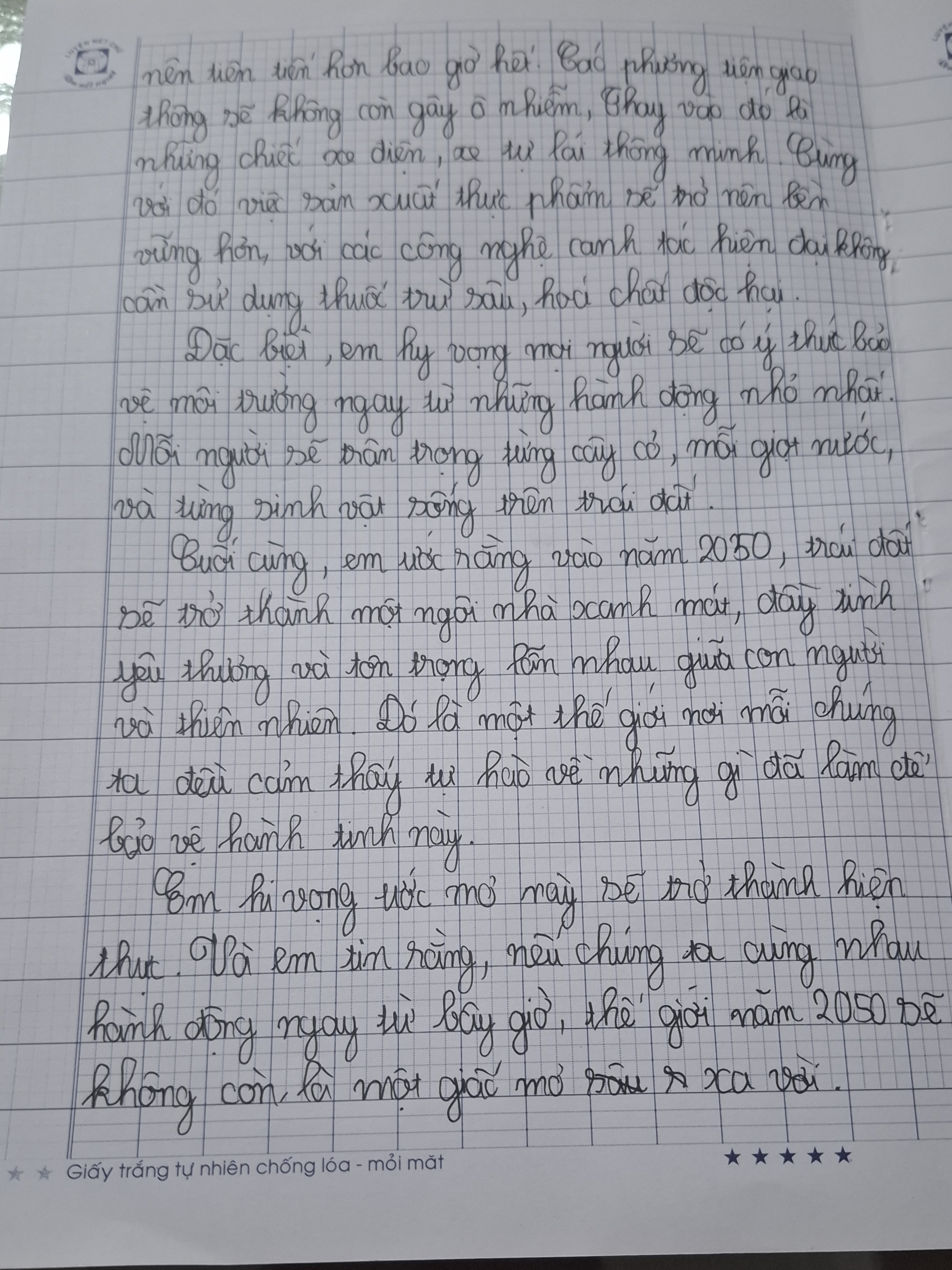 Chia sẻ uớc mơ liên quan đến năng lượng xanh, giáo dục xanh, lối sống xanh về cuộc sống xanh trên Trái đất vào năm 2050.