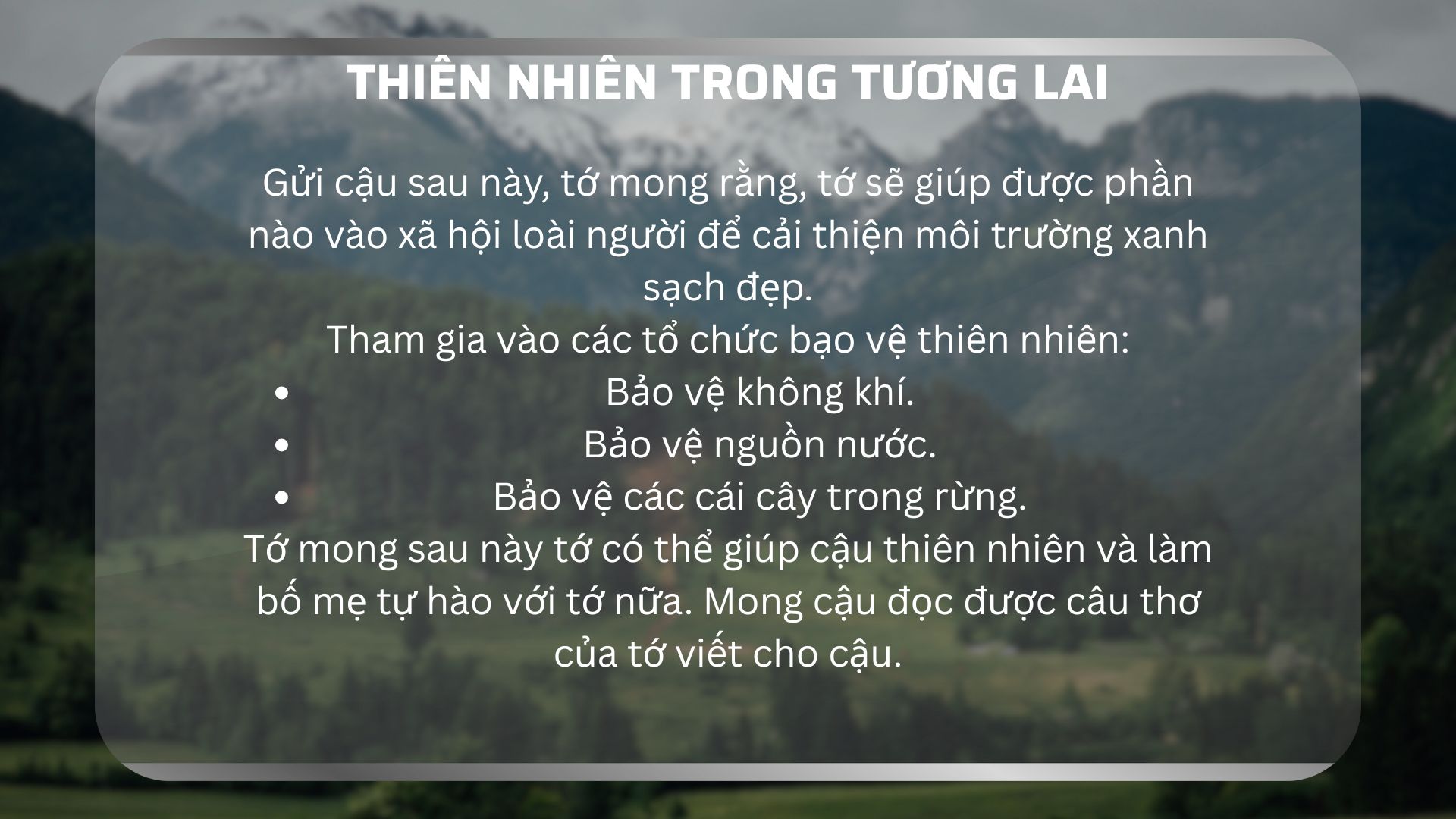 Chia sẻ uớc mơ liên quan đến năng lượng xanh, giáo dục xanh, lối sống xanh về cuộc sống xanh trên Trái đất vào năm 2050.